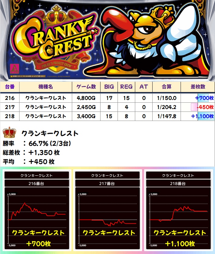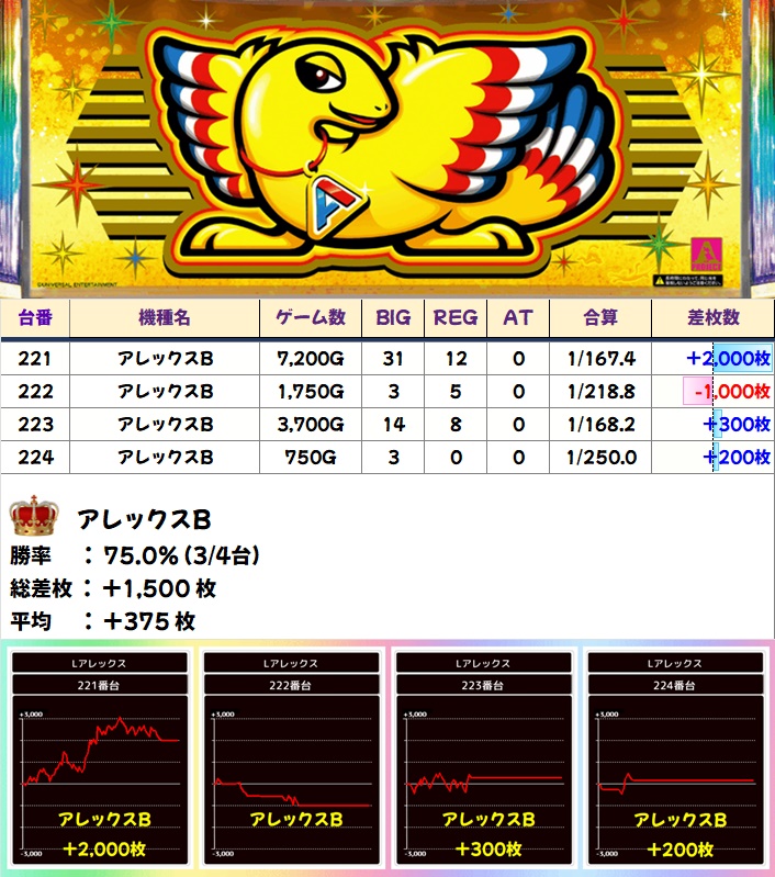 そして⑧の日と言えばアクロス系も!今回は【クランキークレスト】【新ハナビ】【アレックス】からボーナス合算良き台を多数確認!その他のアクロス系(バーサスリヴァやニューゲッタマ)からも単品を確認できただけに、⑧の日のアクロス系は最低でも機種イチには期待できる好状況!