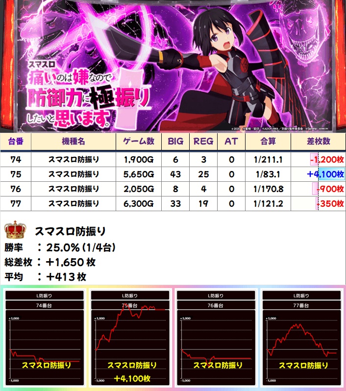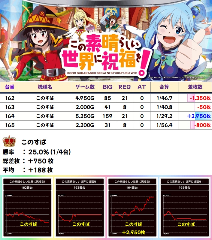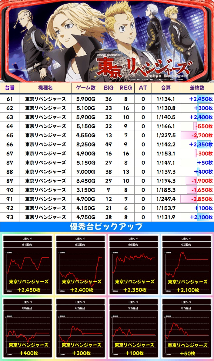 目立った出玉自体はなかったものの、【東京リベンジャーズ】【防振り】【このすば】からはグラフ的に優秀台と思わせる台が各機種半数以上は確認できただけに、高配分だった可能性が高そうだった!?