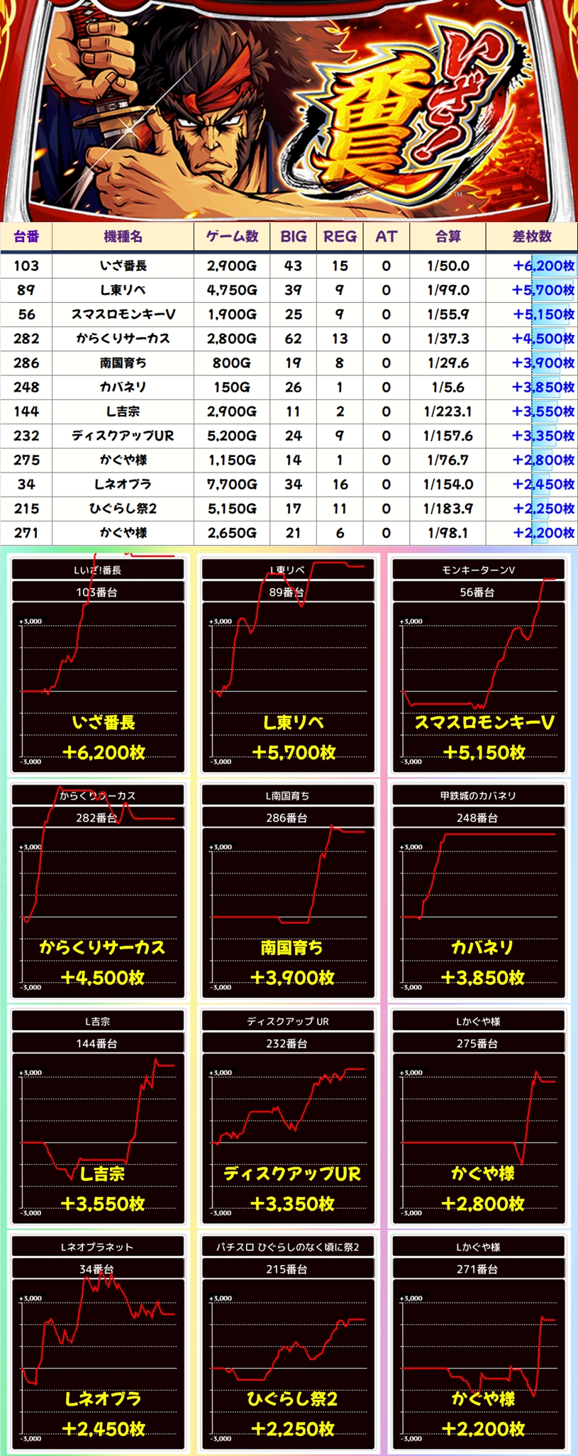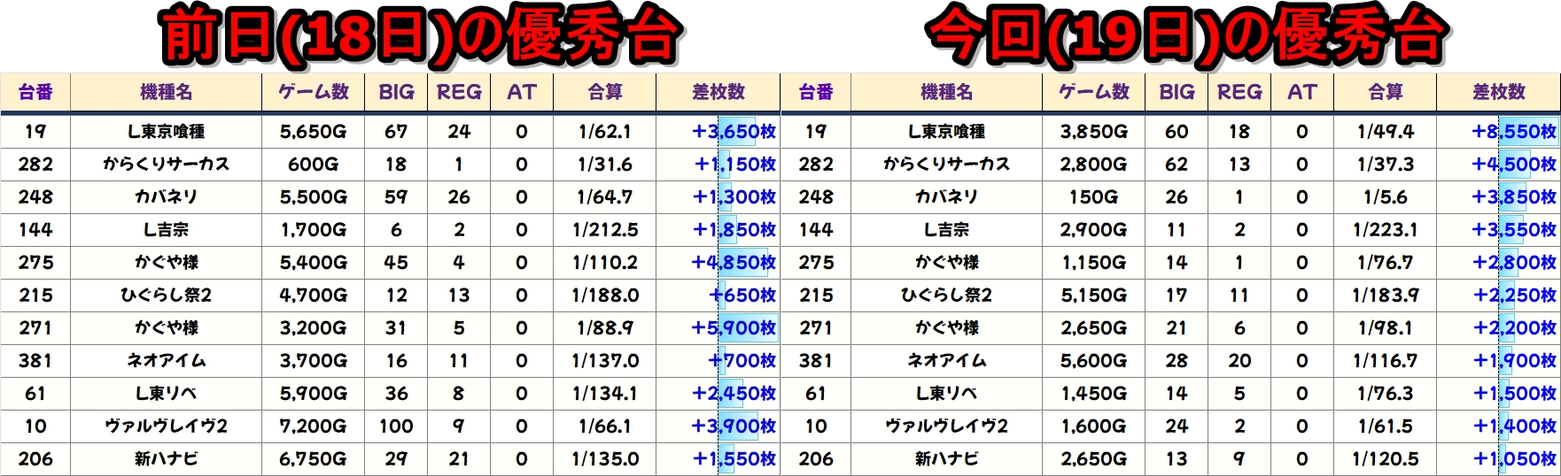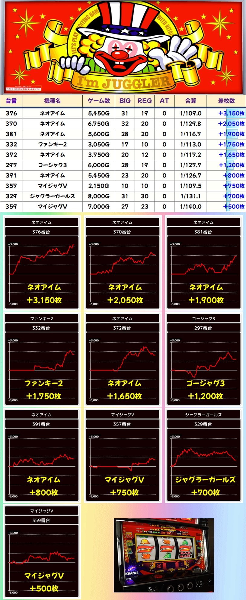 【ネオアイム】を中心にジャグ系からも優秀台が数多く登場。前日優秀台の据え置きも多くありそうなので、18日の翌日は狙いやすい状況です!