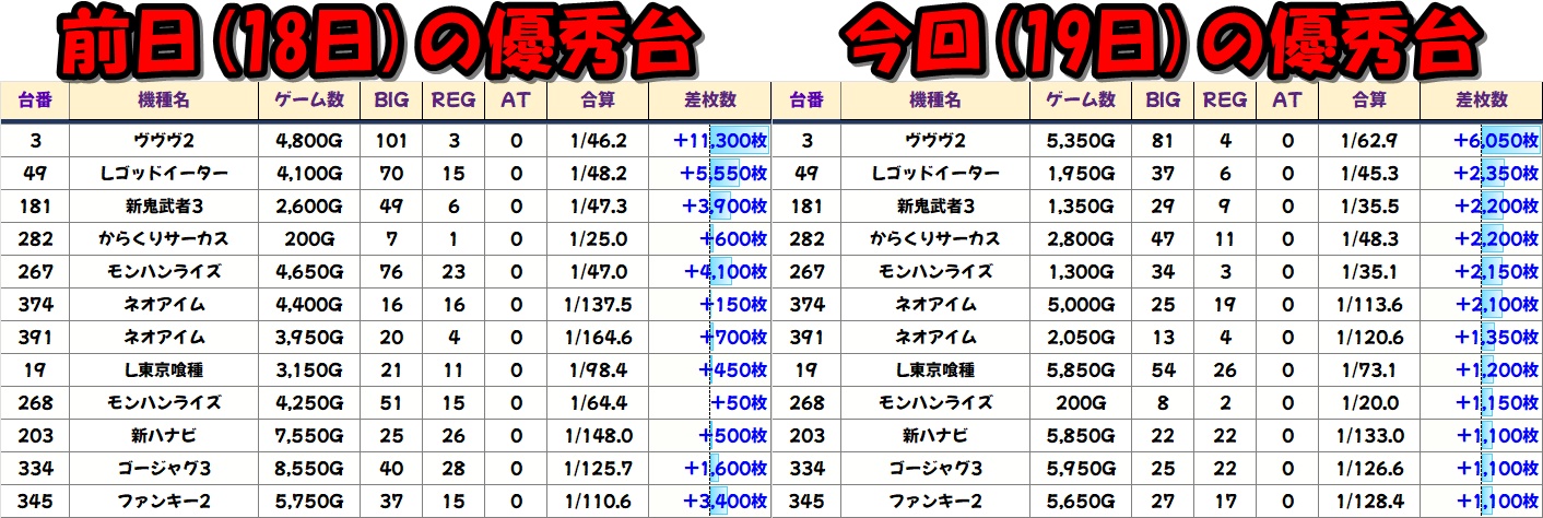19日と言えば前日18日の据え置きも特徴の一つ!前日の優秀台をチェックしておけば次の日が立ち回りやすくなること間違いなし!