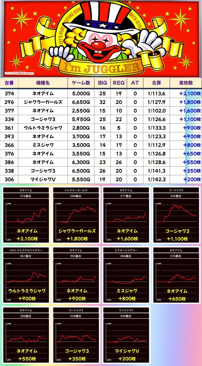 【ネオアイム】を中心にジャグ系からも優秀台が多数アリ。前日優秀台の据え置きも確認できたので、18日の優秀台チェックは欠かさないように!