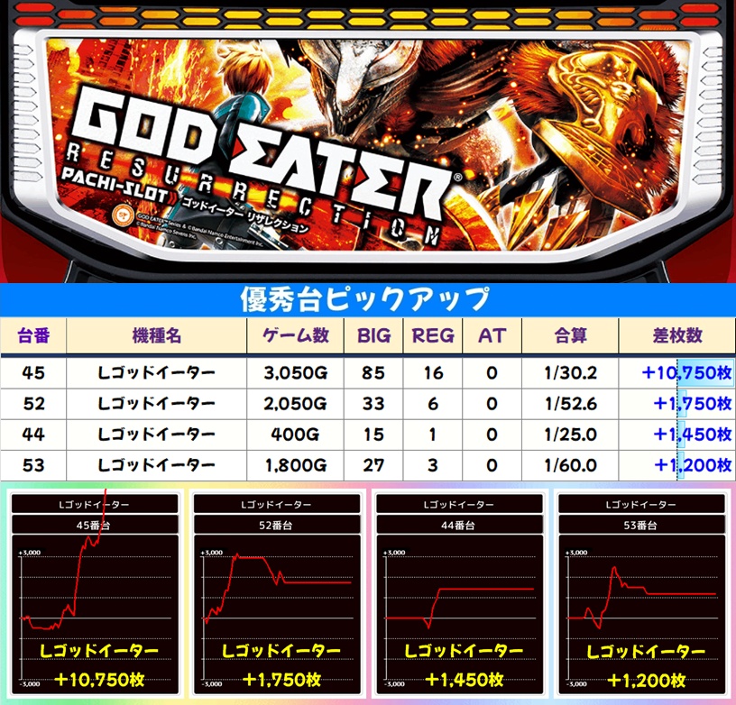 今回は万枚オーバー台が【北斗転生2】【東京喰種】【ゴッドイーター】の3機種から出現!東京喰種のランクインが特に目立った一日でしたね!