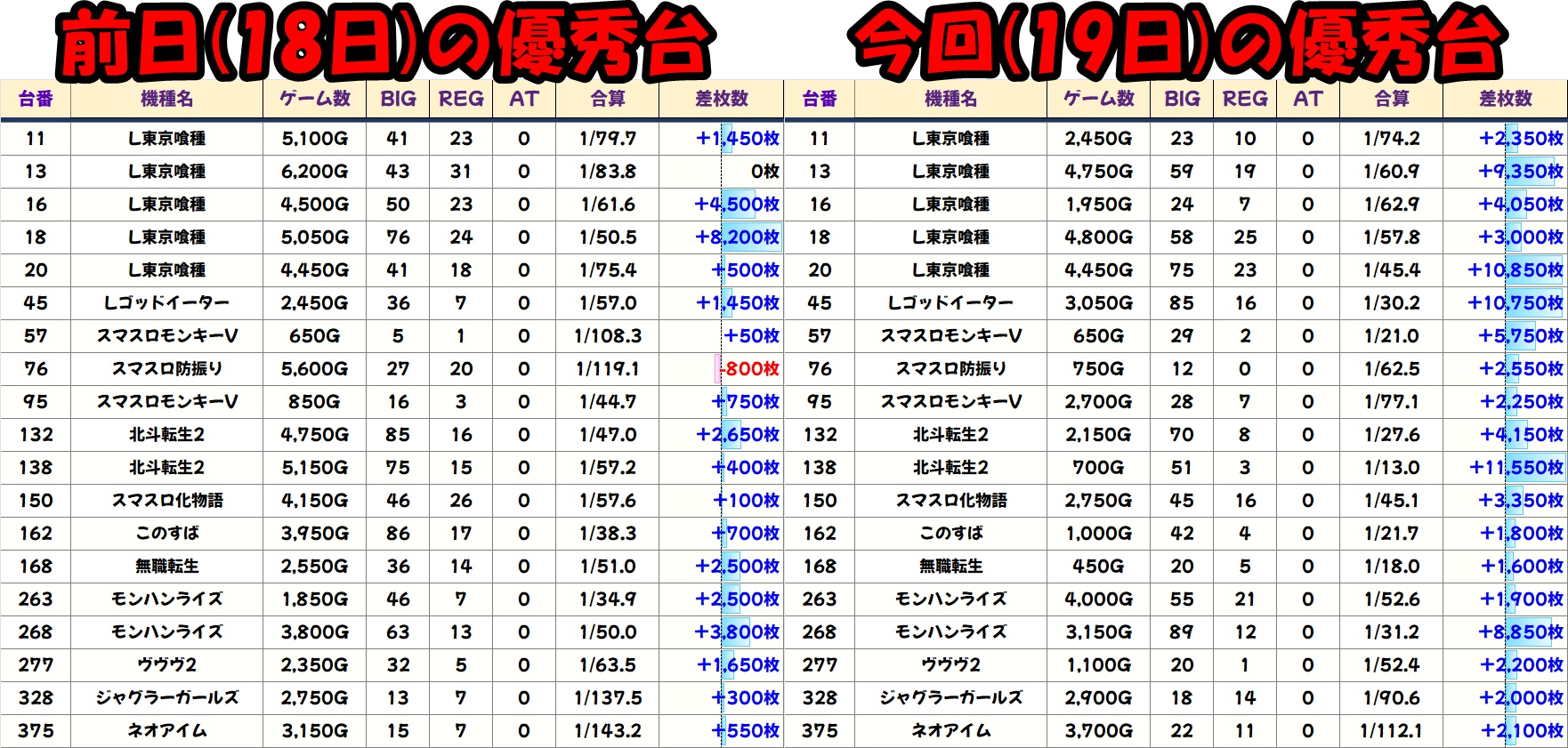 破天荒取材ではお馴染みの【東京喰種】【マギレコ】は、今回も超好結果に!【東京喰種】は16台中9台が2000枚以上のプラス!そして【マギレコ】からも高配分だった可能性が高そうでした。やはり19日はこの2機種が最優先です!