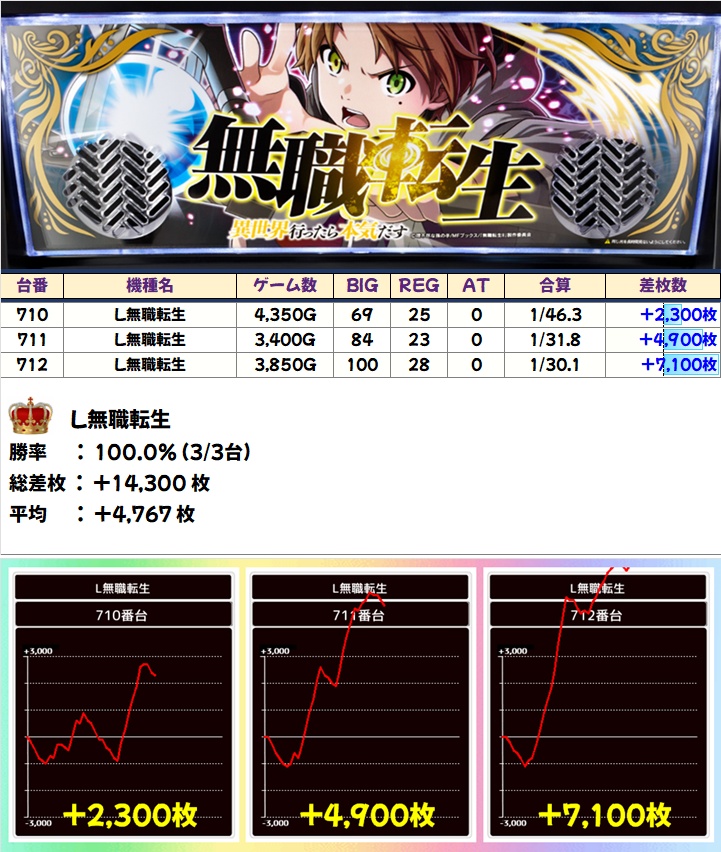 両機種に+4000枚以上の優秀台を確認できましたが、特に「「L無職転生」は+7100枚を筆頭に全台+2000枚以上で、機種別でナンバーワンの平均+4767枚を叩き出しました!