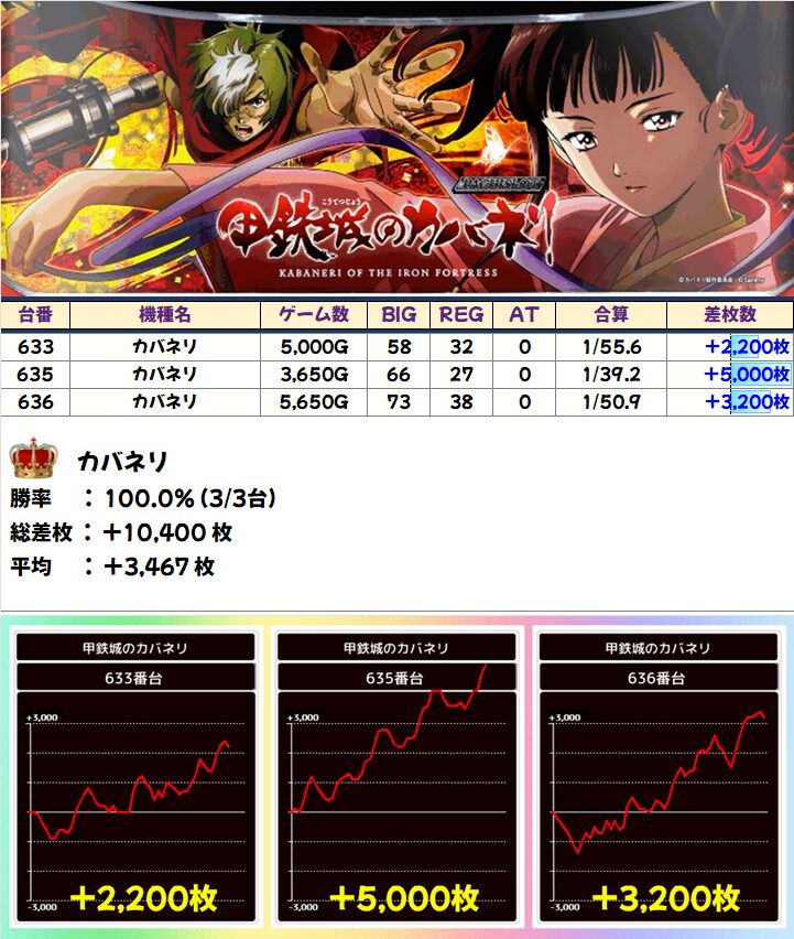 そして大注目の「カバネリ」ですが、+5000枚を筆頭に全台+2000枚以上で平均+約3500枚と今回も期待を裏切らない素晴らしい結果に!