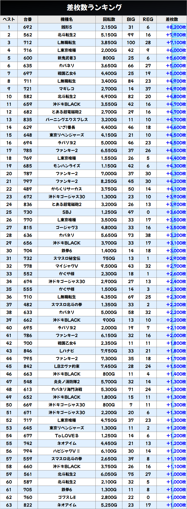この日は+5000枚以上×7台を含む、60台以上の台が+1000枚を突破!次回も期待ですね!