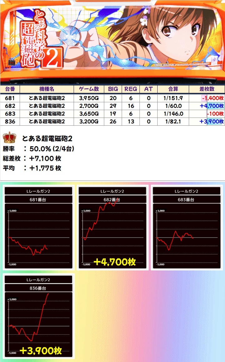 「戦国乙女4」は+5000枚を筆頭に全台プラス、「とある超電磁砲2」は半数の台が+4000枚クラスとしっかり結果を残しました!