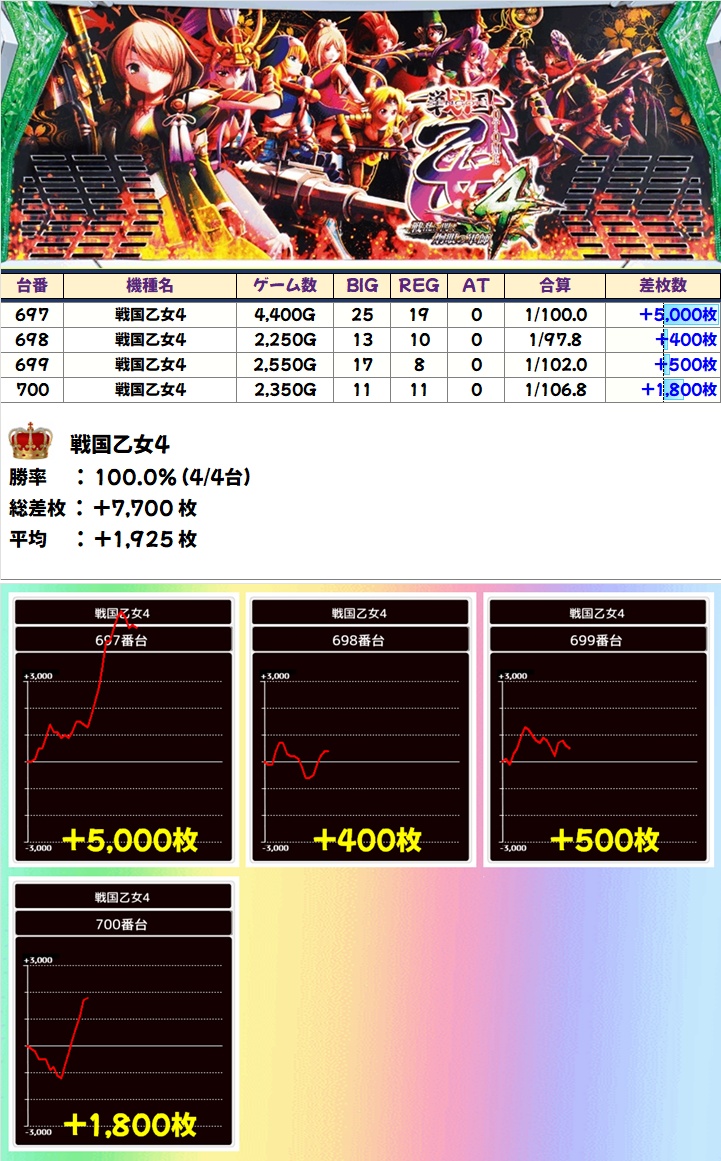 【全系候補】戦国乙女4(4/4台+)➡平均+1,925枚