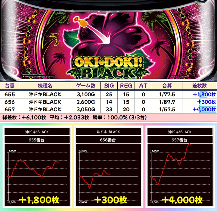 【3台並び】沖ドキBLACK:655-657番台➡平均+2,033枚