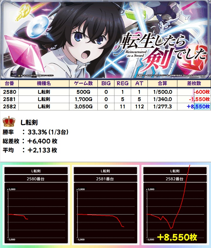 「L転剣」からは+8500枚以上の猛爆台を確認! 全体的にもう少し稼働があれば更なる出玉に期待できたかなと。