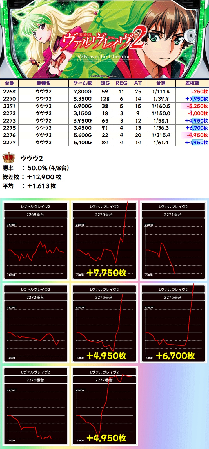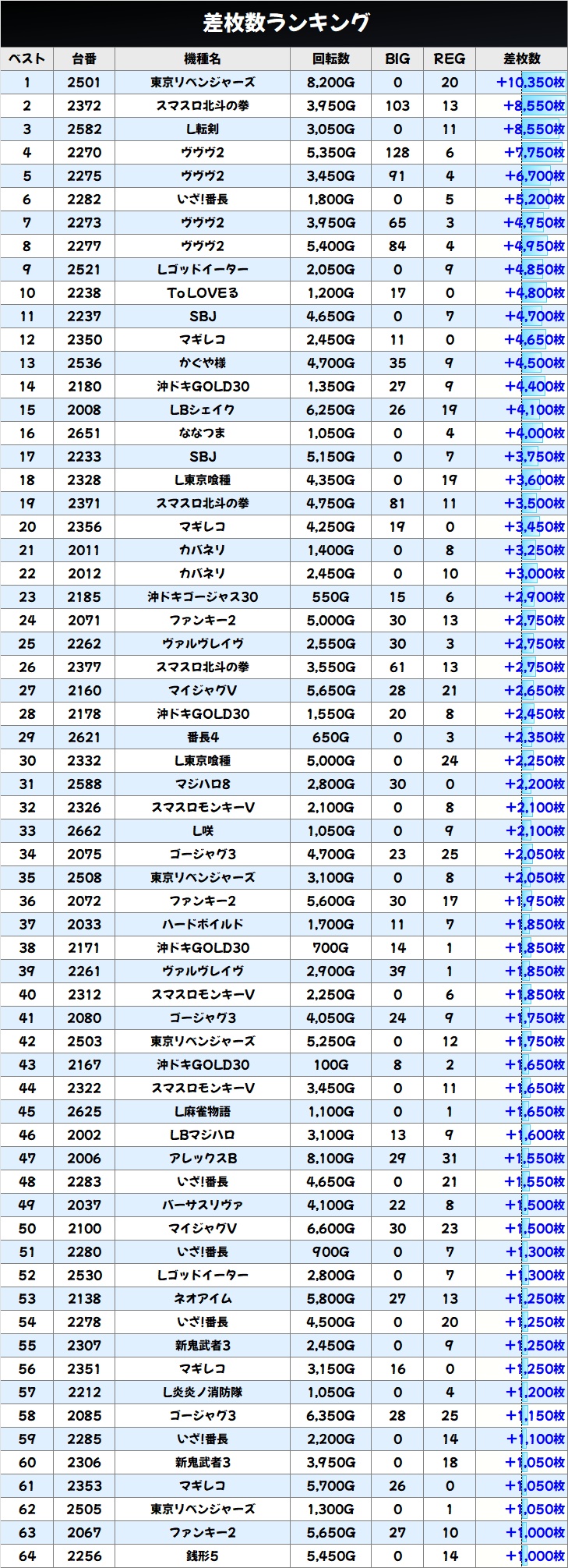 +8000枚クラスを筆頭に8台中4台が+4500枚以上と抜群!