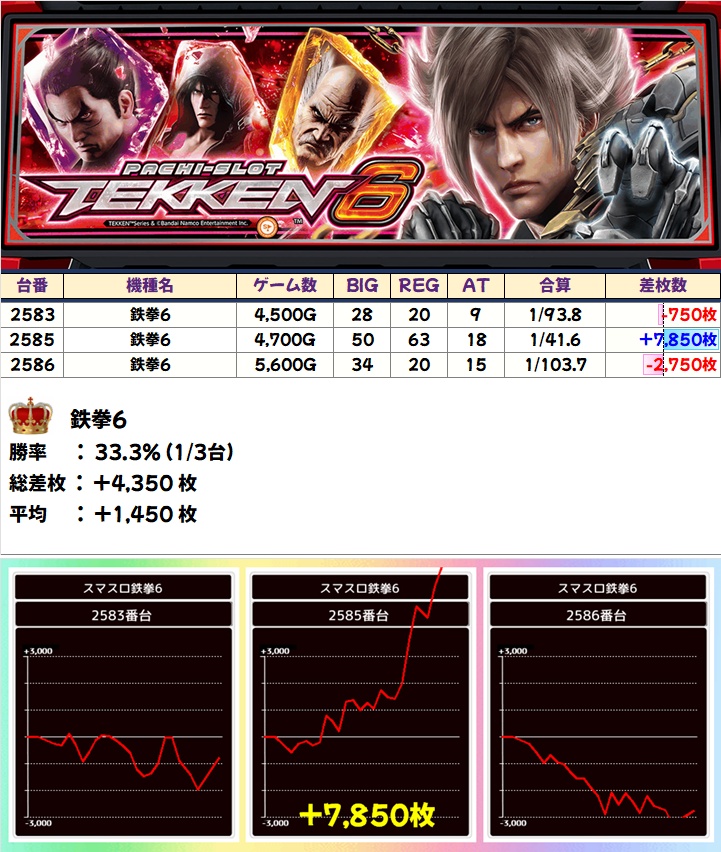 「鉄拳6」は+8000枚クラスがあったものの、やや不発気味。ただ全台稼働は抜群なので打ち手は手応えを感じていたかなと!
