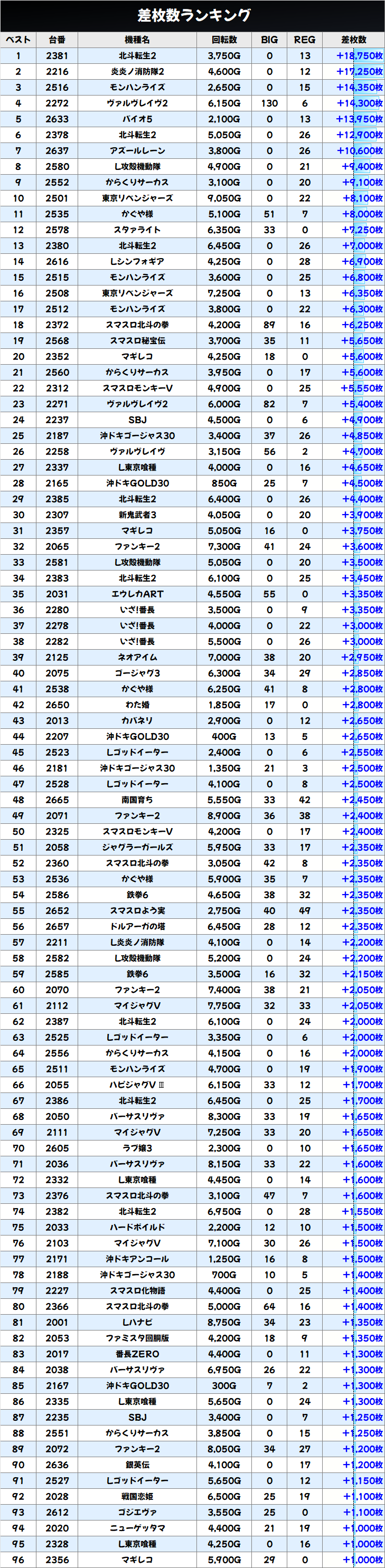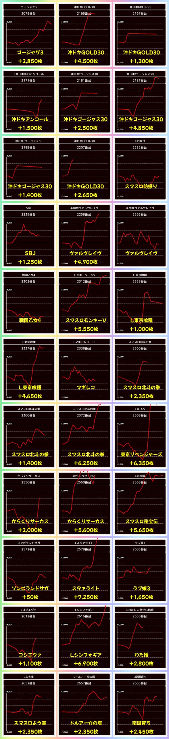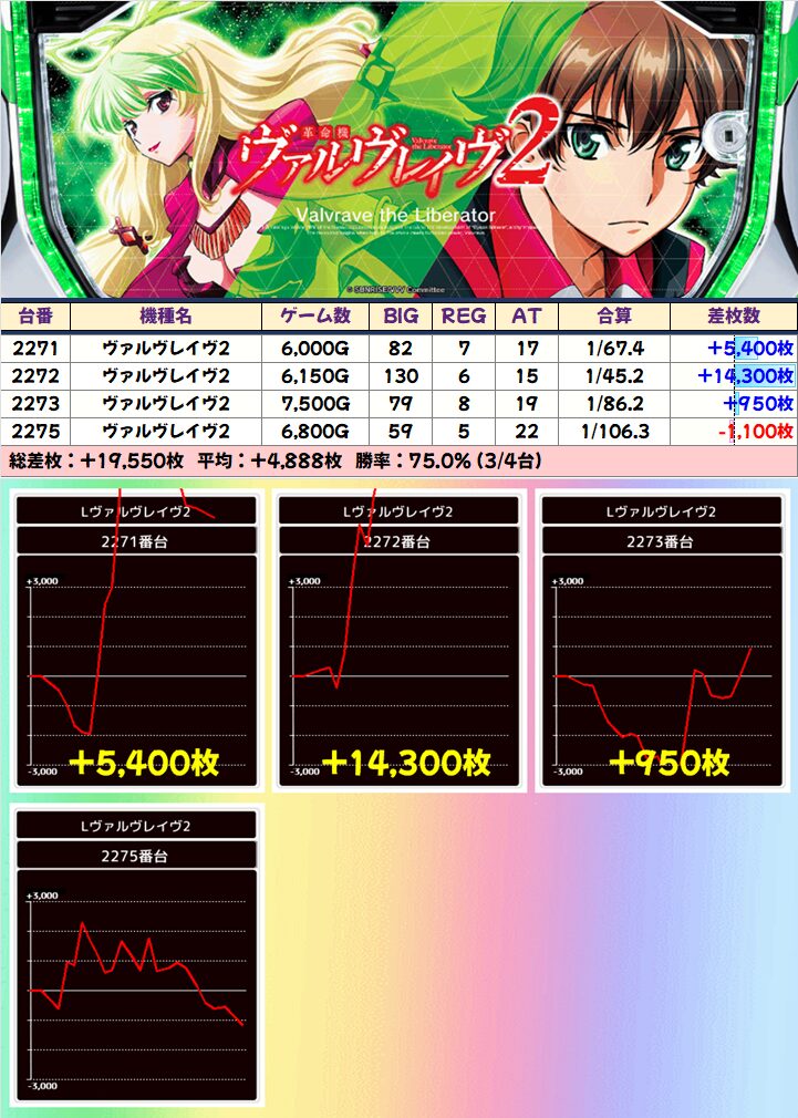 メインの3機種から4台並びを確認!「ヴァルヴレイヴ2」は万枚オーバー、+5000枚以上!「いざ!番長」は4台中3台が+3000枚以上と目立ちまくりでした!