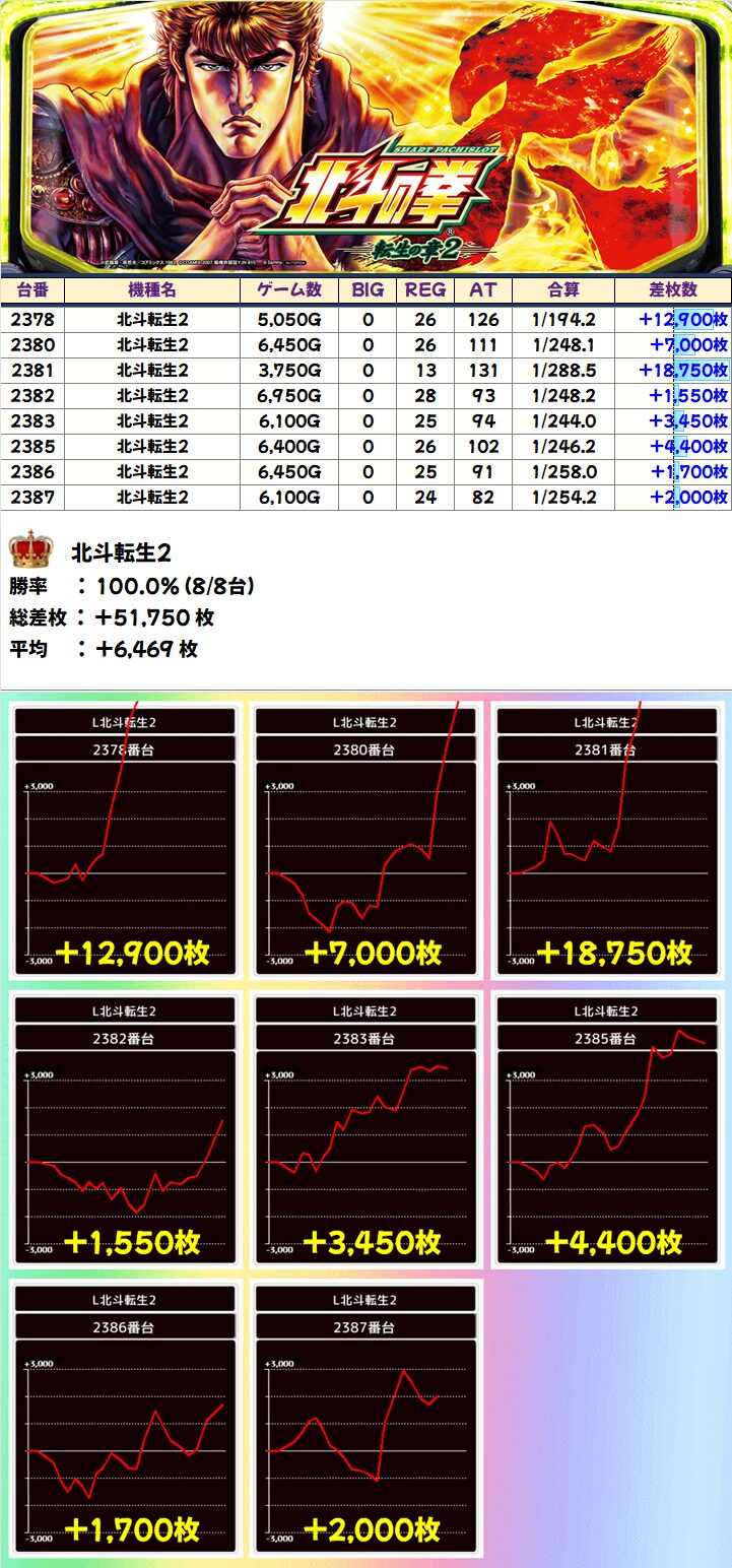 コンプ台&+13000枚と複数の万枚を筆頭に全8台が+1000枚を大きく上回り、平均+6000枚オーバーと異次元の好結果に!