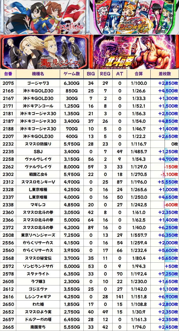 前述した大量の仕掛け以外にも「スタァライト」「Lシンフォギア」「東京リベンジャーズ」「スマスロ北斗の拳」の+6000枚以上など単品優秀台も非常に充実していました!