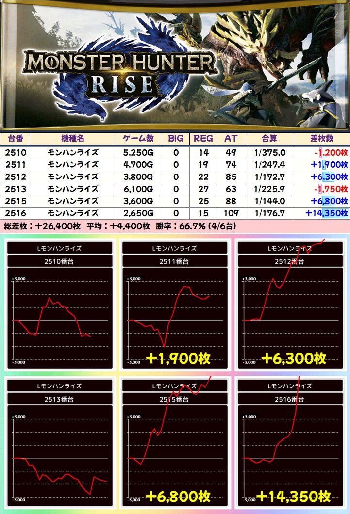 まず紹介するのは「モンハンライズ」の6台並び!万枚オーバーを筆頭に6台中3台が+6000枚以上と大爆発!