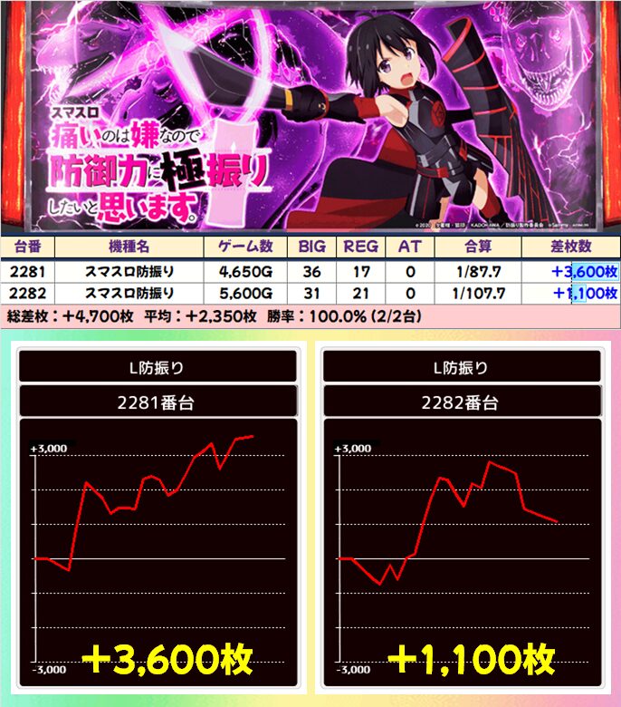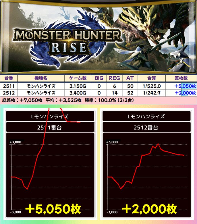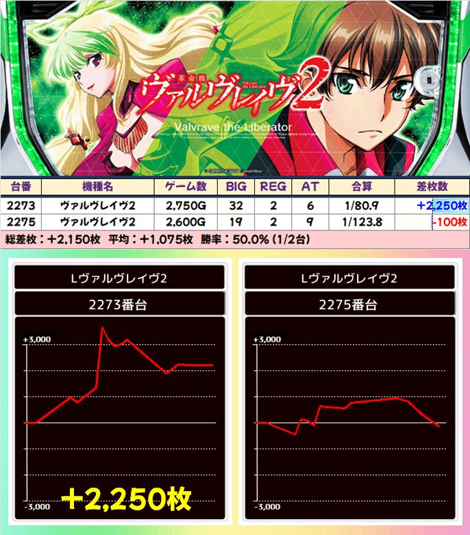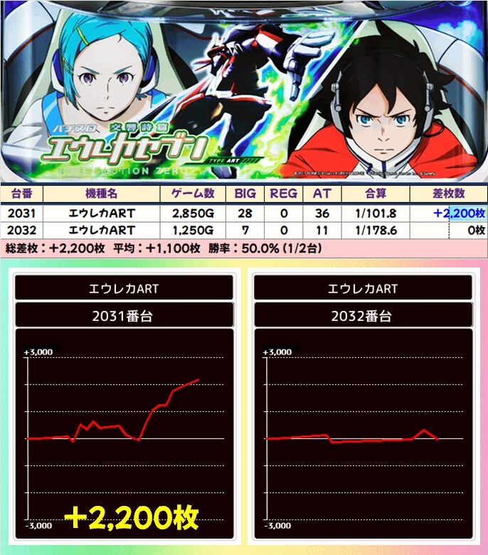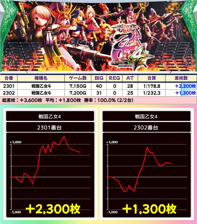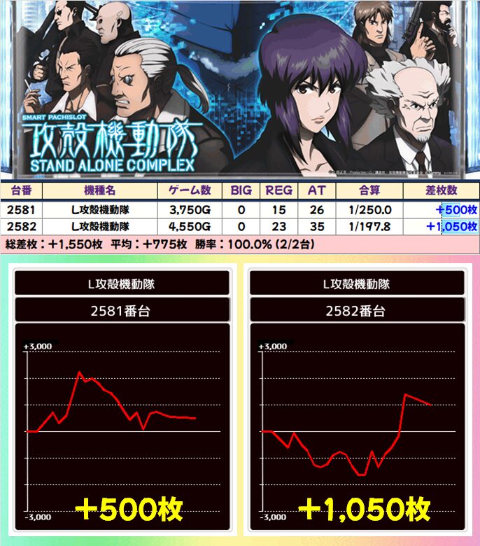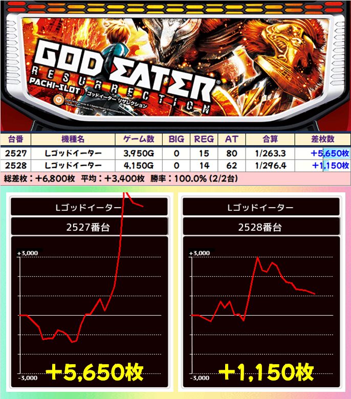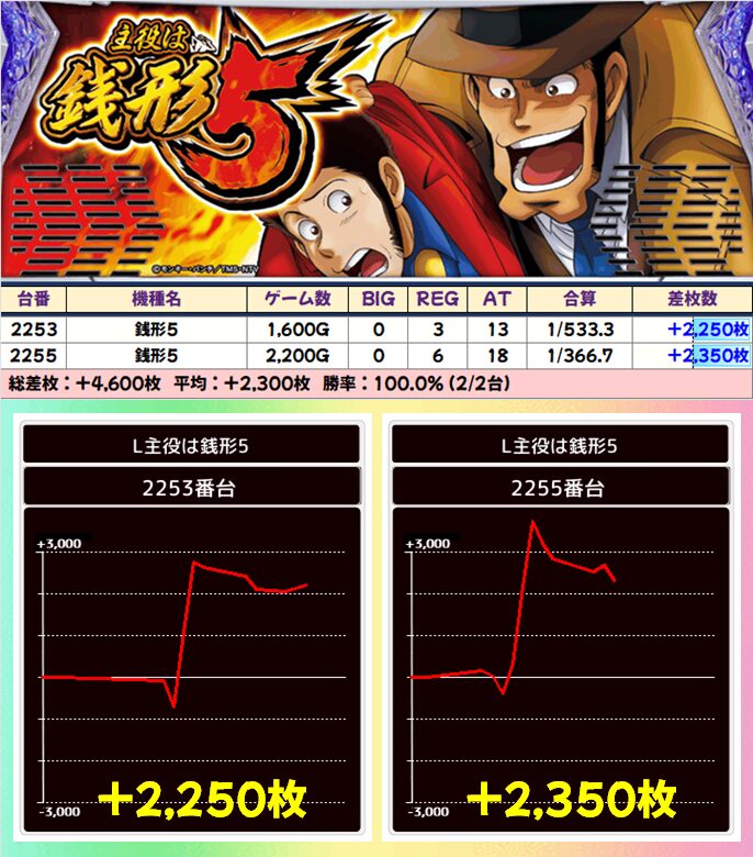 6台中4台が+1500枚以上を達成!後述する並び仕掛けにも絡んできたのも見逃せないポイント!