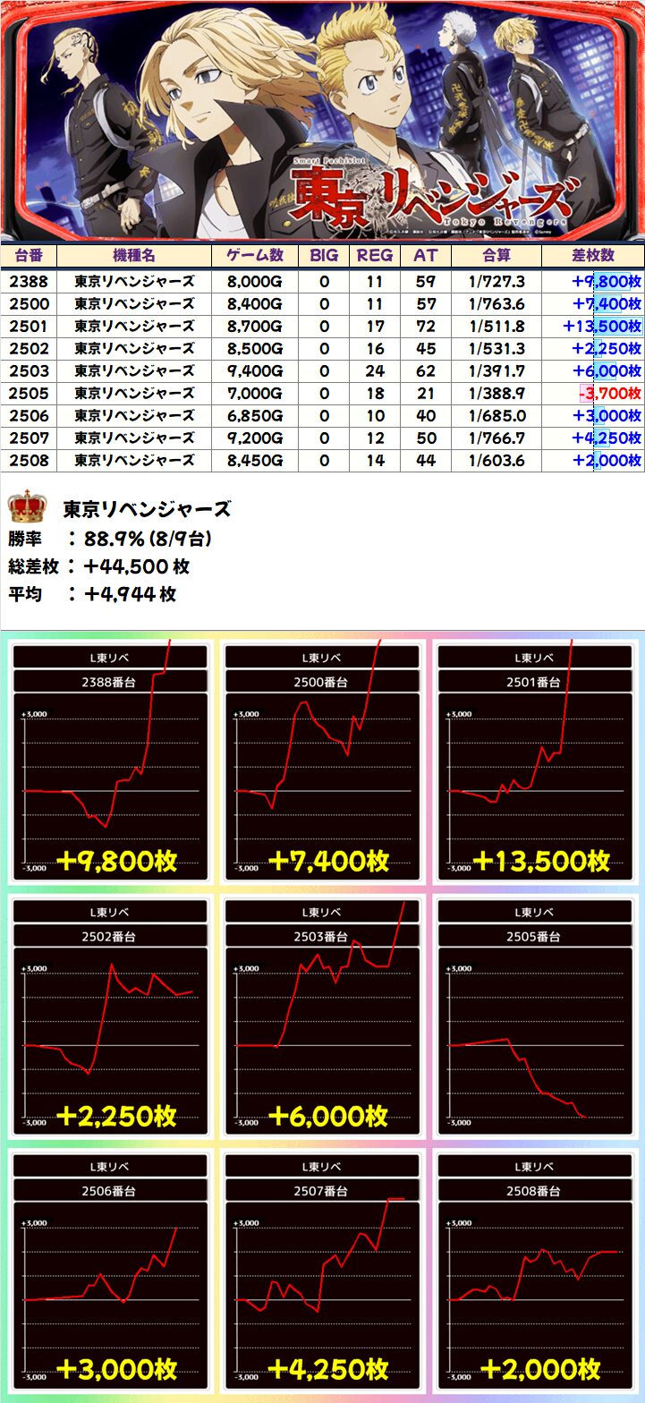 東京リベンジャーズ(8/9台+)➡平均+4,944枚