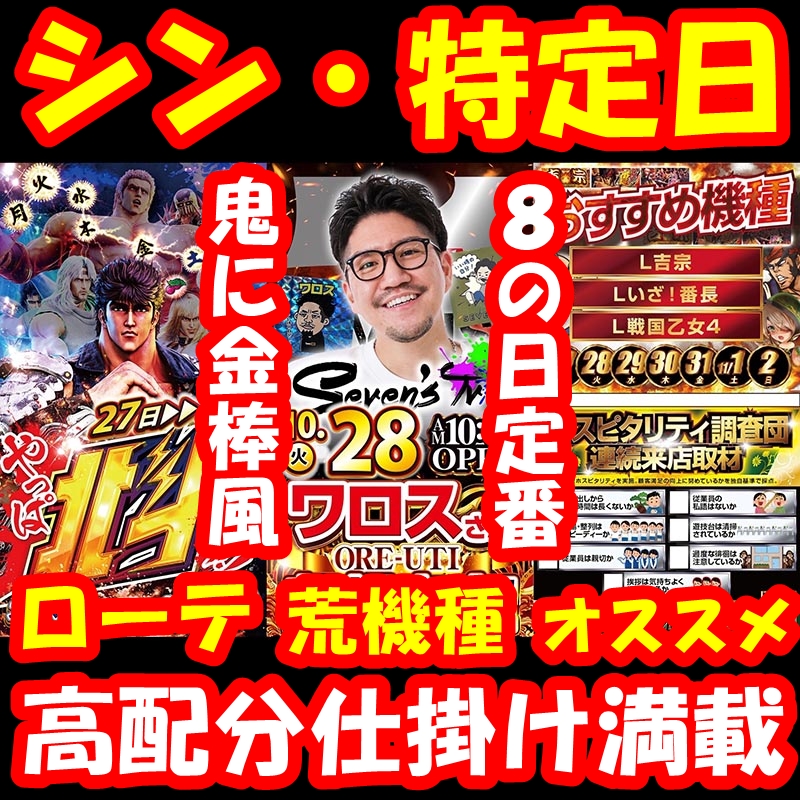 北斗はローテーションと思われる内容で、ワロスさんの取材は「荒い機種」に対しての仕掛けか。そしてオススメ機種にもなっている吉宗は8のつく日の定番機種でもあり、他2つもどのような配分なのか気になるところですね。