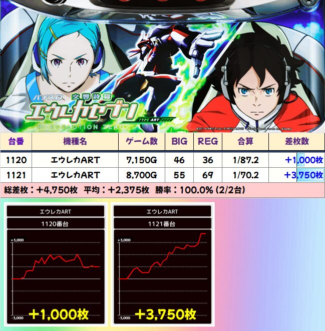 セブンズTV→エウレカセブン繋がり…か?明らかに全台系と思わしき仕掛けでド安定グラフ。この2台も息が長くて仕掛けられる頻度が高いですね!