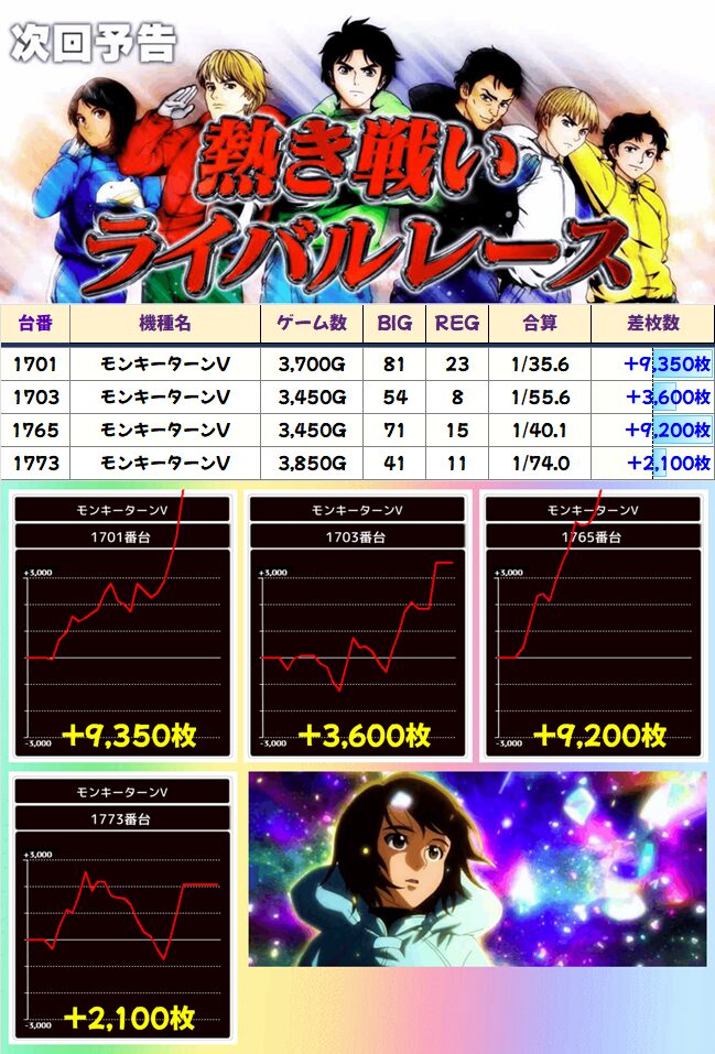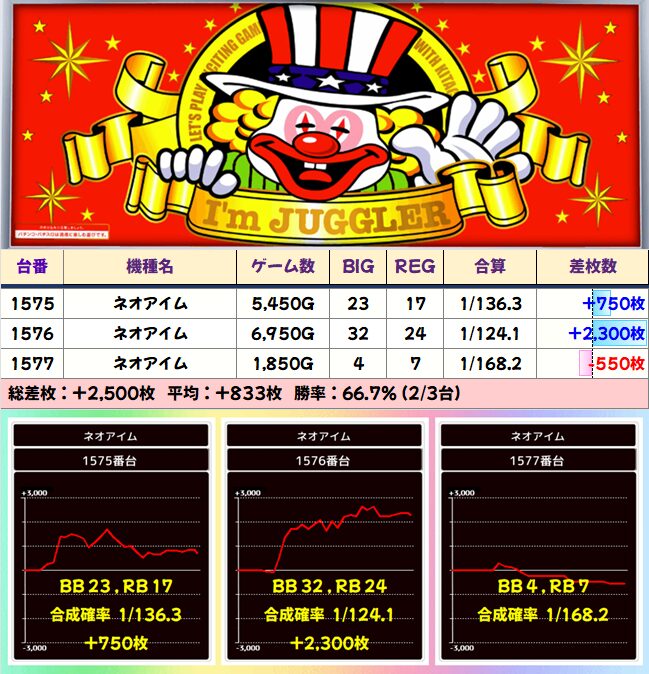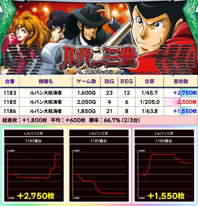 20台中9台がプラス差枚で終了。ワロスさんの好きな「荒い機種」の筆頭ということで、ここは仕掛けてきた可能性が高いか。