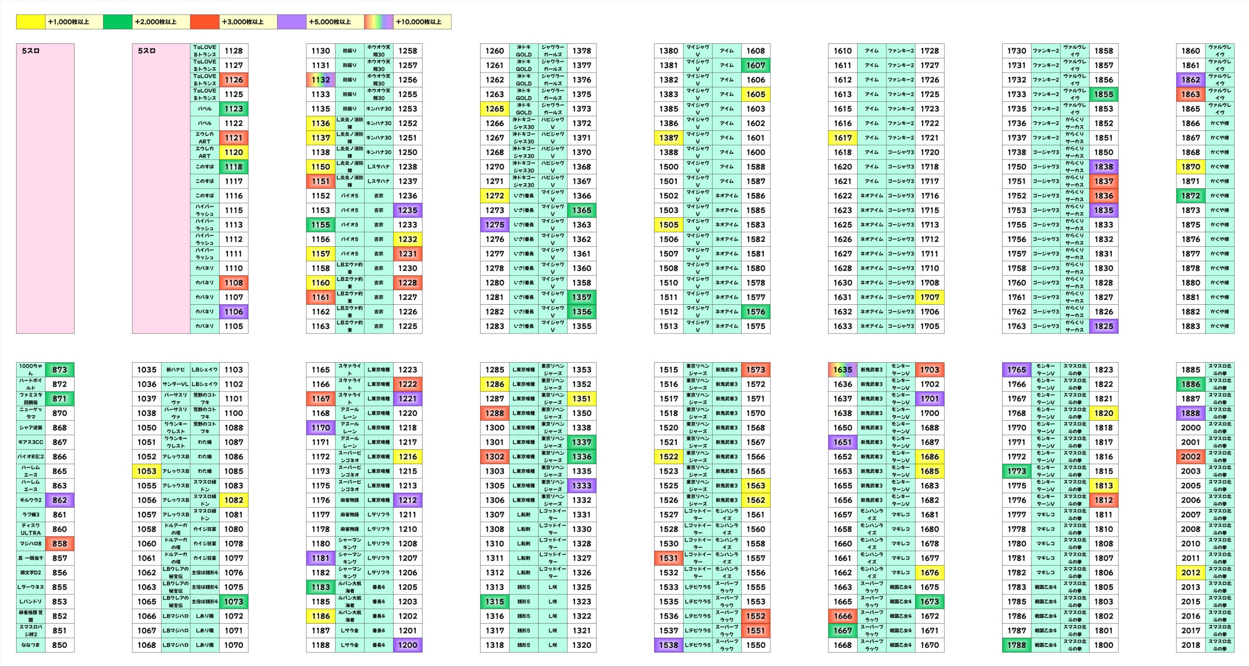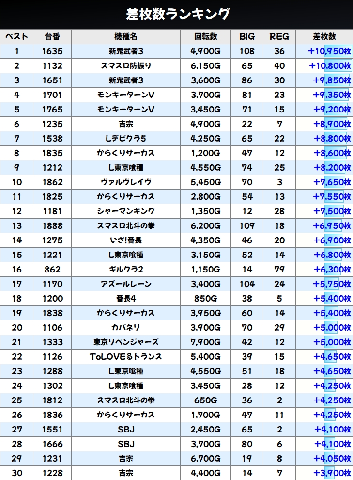 新鬼3、モンキー、東京喰種、吉宗、SBJの名前が割と並んでますね。からくりサーカスは4台もランクインしているので、やはり「荒い機種」に仕掛けが多い感じでしょうか…といっても、スマスロってほとんど荒い気もしますが…。