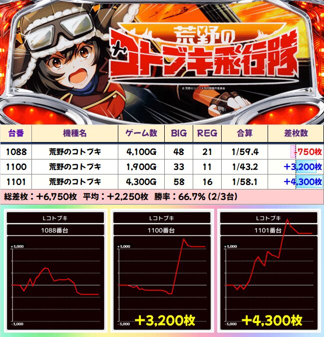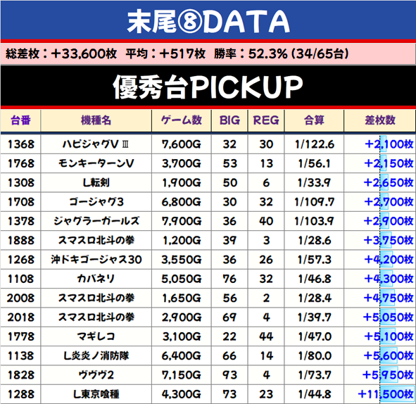 プラス差枚の台は上位ATの破壊力を見せつける結果に。1101番台のような一撃を決めた後もテンポよく伸ばせている台はかなり優秀。