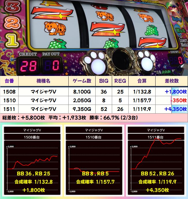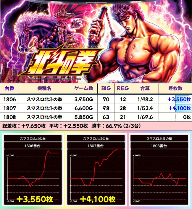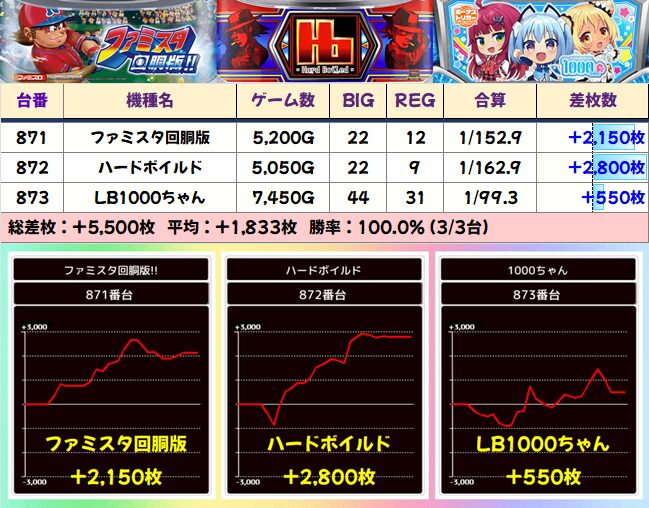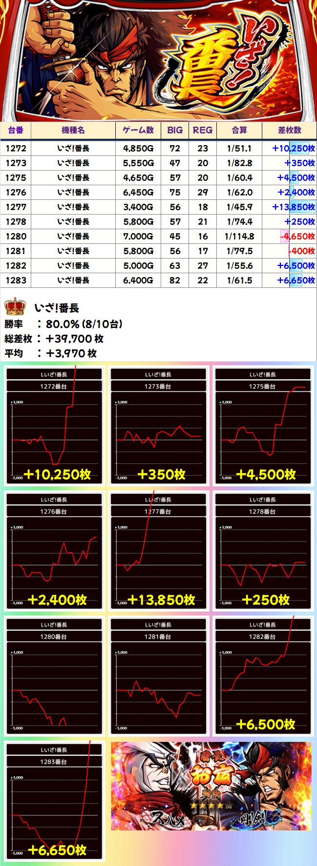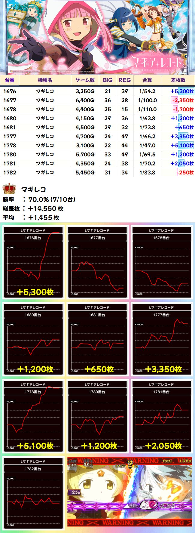 増台するほど人気が高い、いざ!番長とマギレコです。いざ!番長は設定が奇偶で特徴があり、青頂関連で一撃必殺のグラフが目立つ、マギレコは初当り関連やドッペル到達からの伸びが際立っていました。