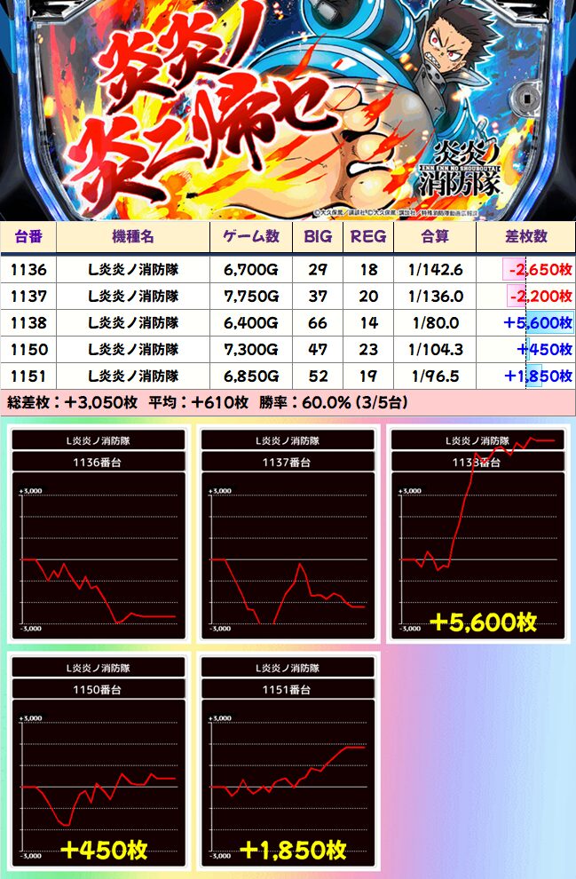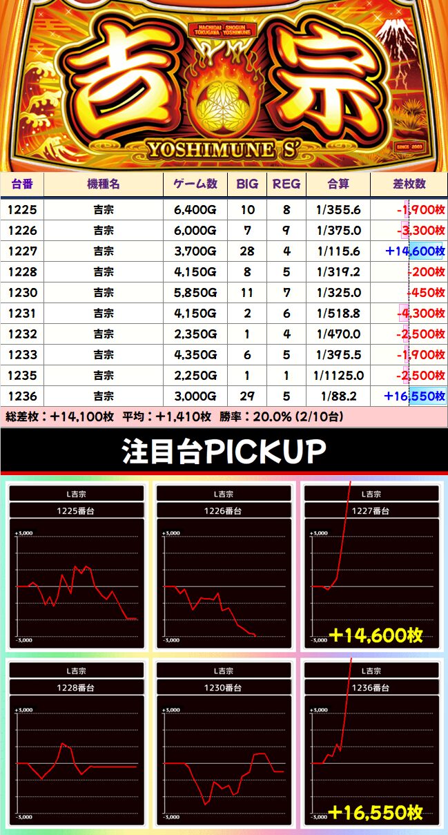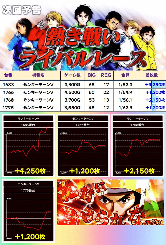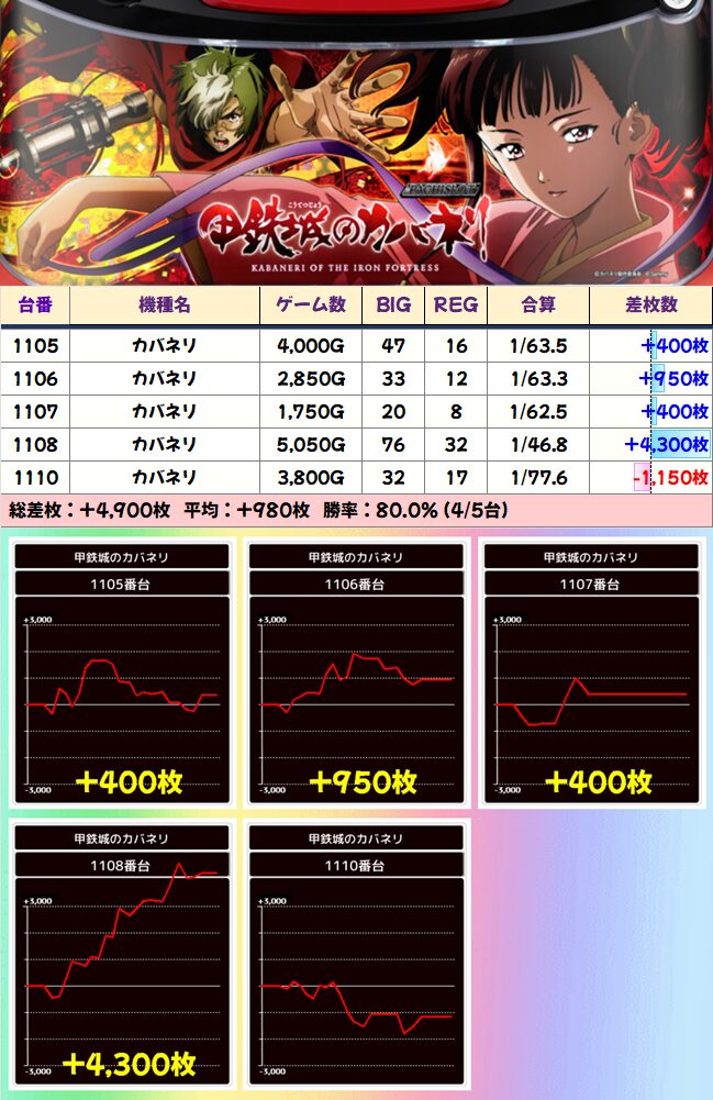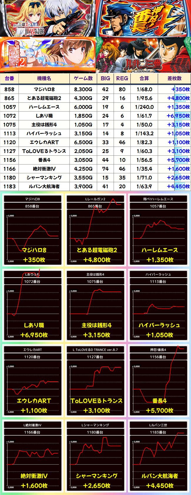 新台である絶対衝激IVは1台のみですが、大きなハマリがなくプラス域をキープ。他だとエウレカ、マンキン、ルパンあたりが一撃頼みではない点に注目。