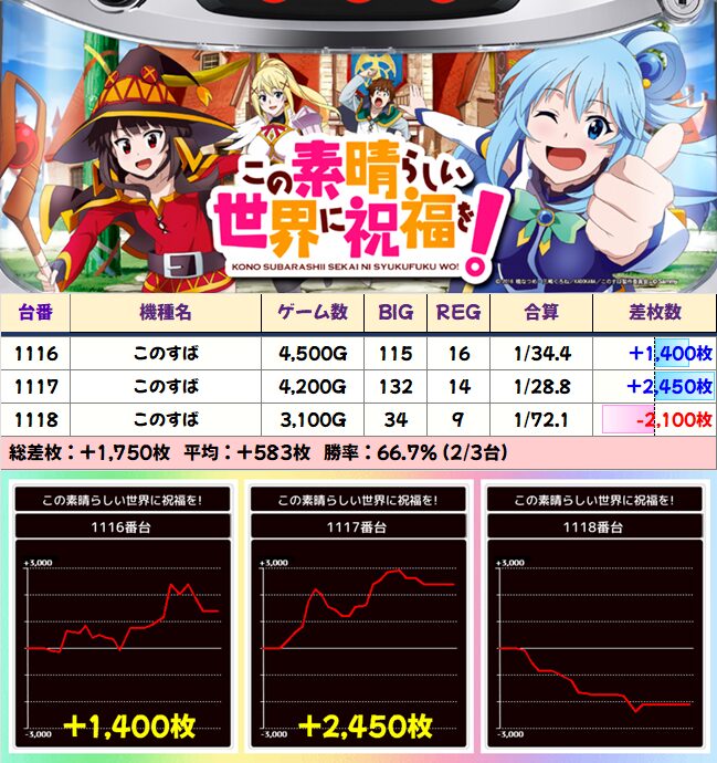 だいぶ息の長い機種となっている「このすば」のAT機。プラス差枚の台はマイナス域がほぼないのでお風呂によるレベル上げも容易だったか。