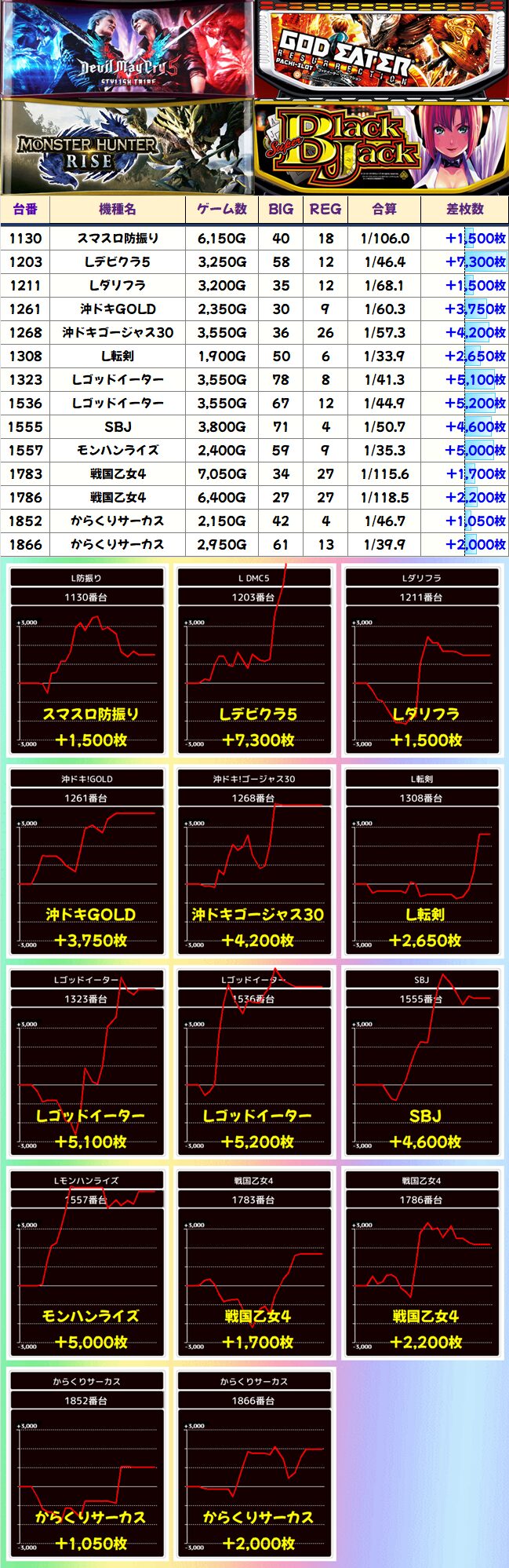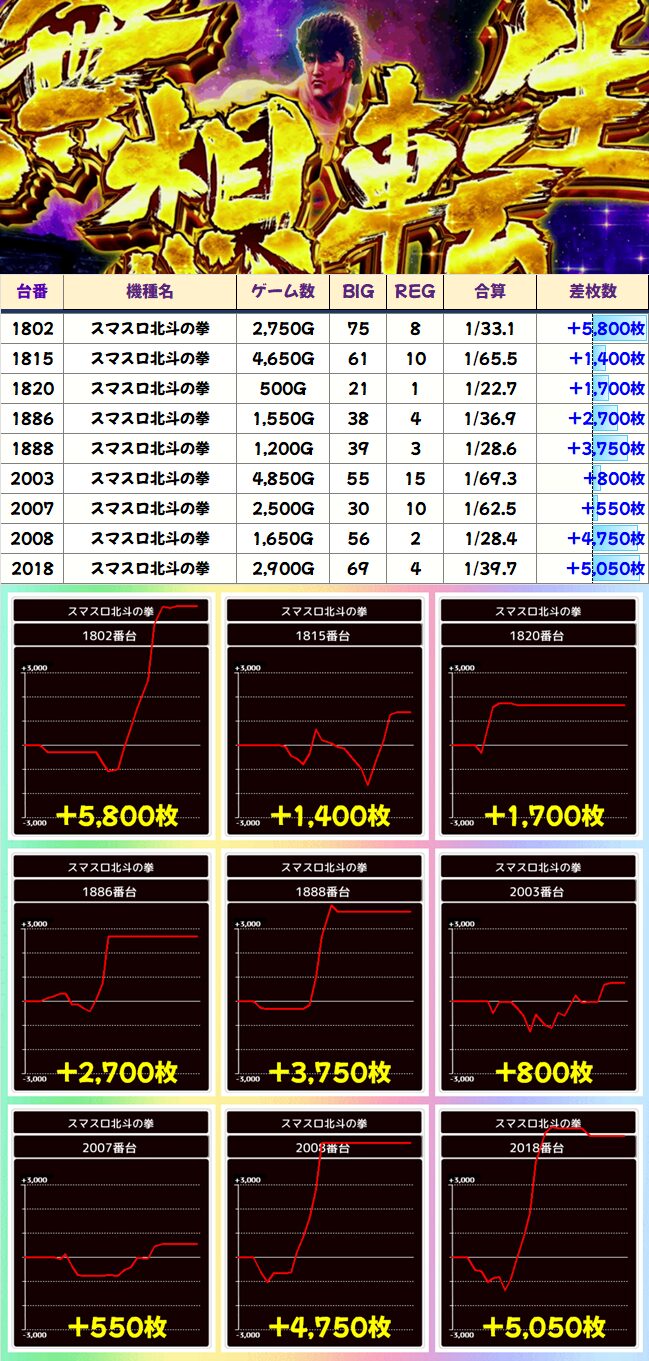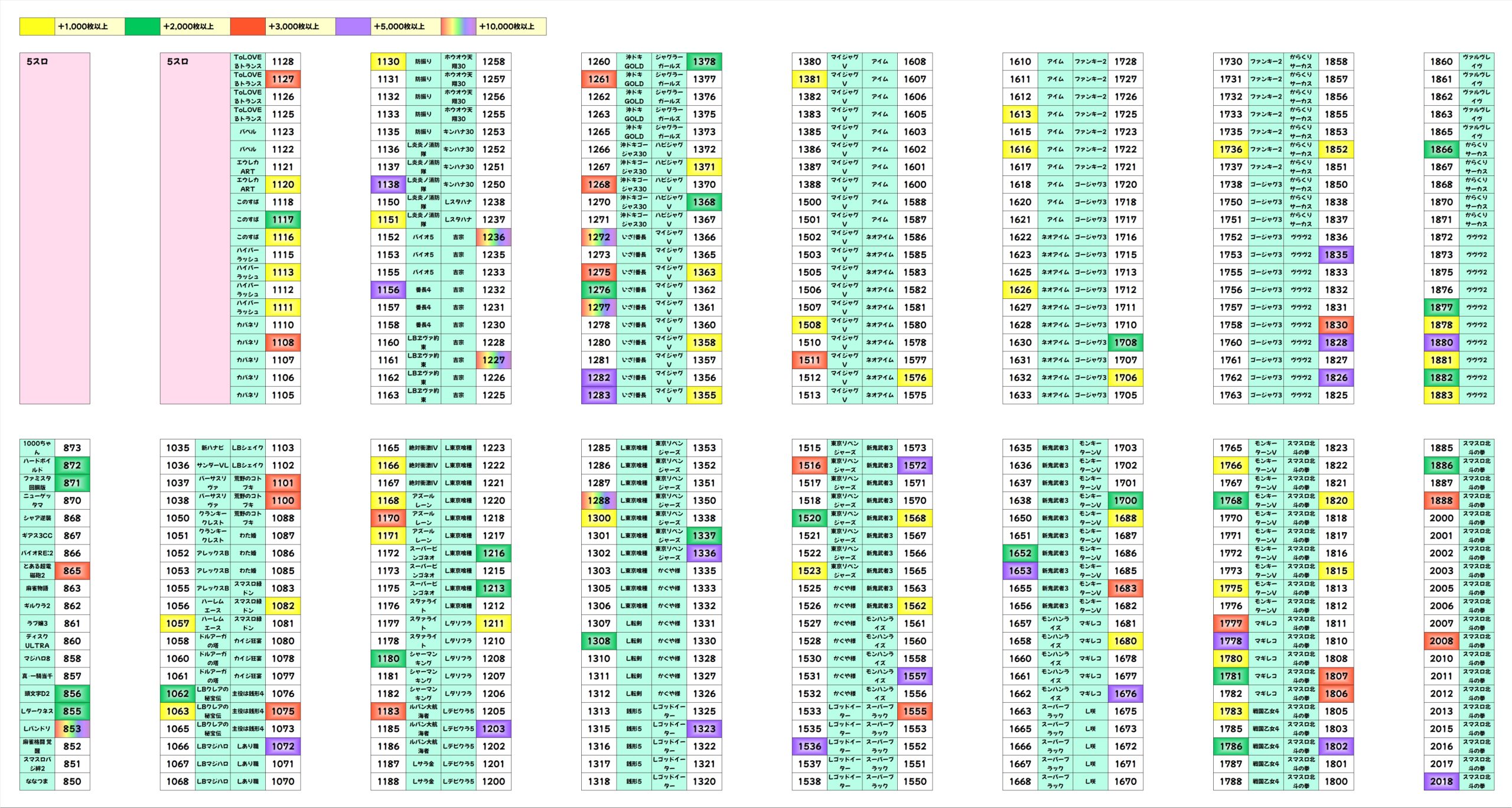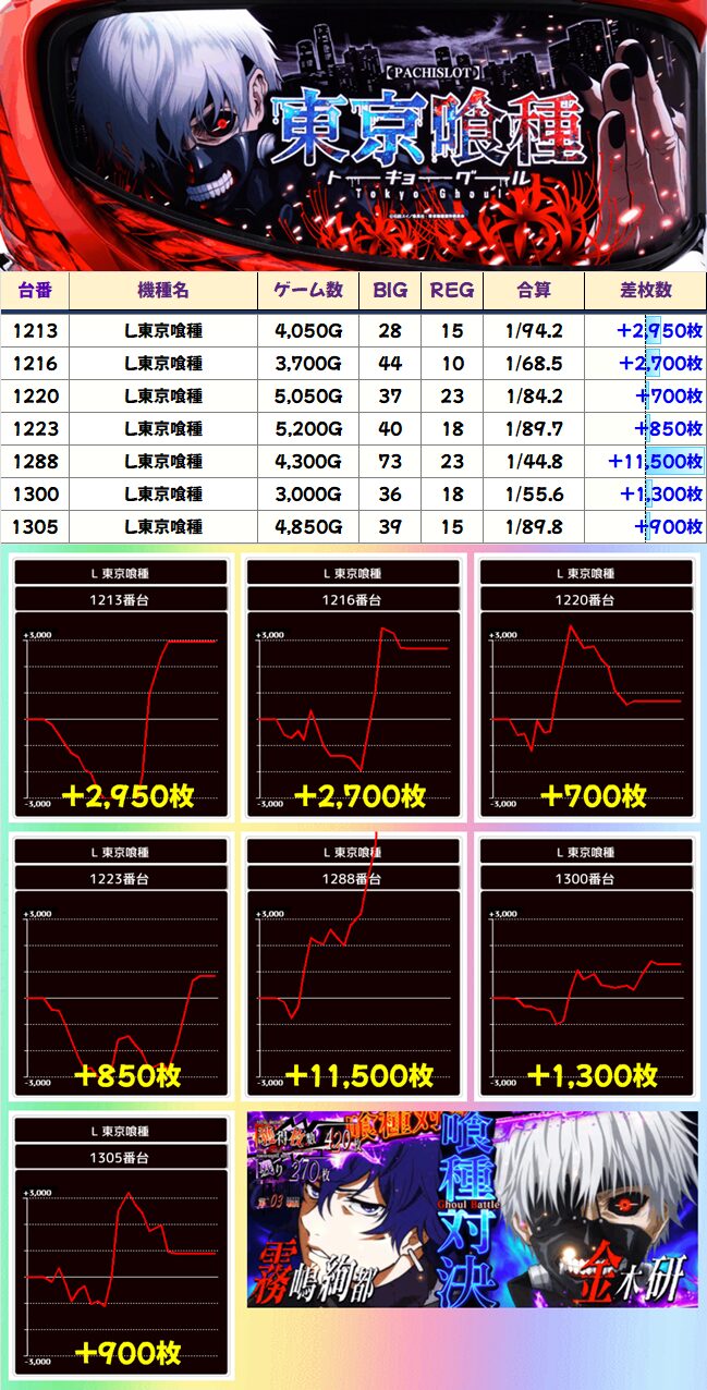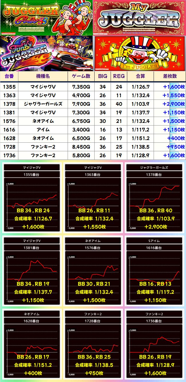 台数が多いので2000枚以上の台のみピックアップ。目立っているのは万枚突破の東京喰種や、3台もあるスマスロ北斗でしょうか。ノーマルタイプのジャグもしっかり反応しているので、1/2系の仕掛けの可能性がありそうですね!