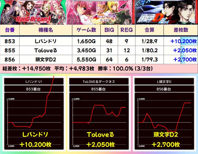 バンドリから万枚が飛び出しました。その影響でここの3台並びの平均差枚もドエライことになってますね…。