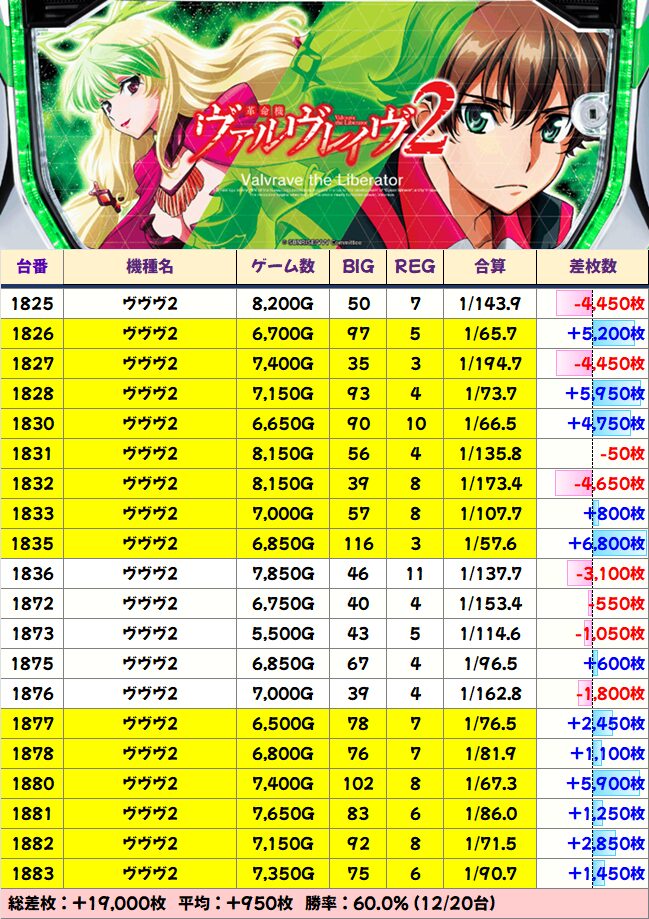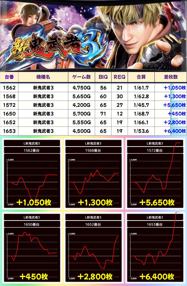 上部で黄色オビを目立たせておきましたが、新台のヴヴヴ2に並びらしき塊がありそうです。8台台並びがあるならここですが、プラスが見事に並んだ6台も気になりますね…。