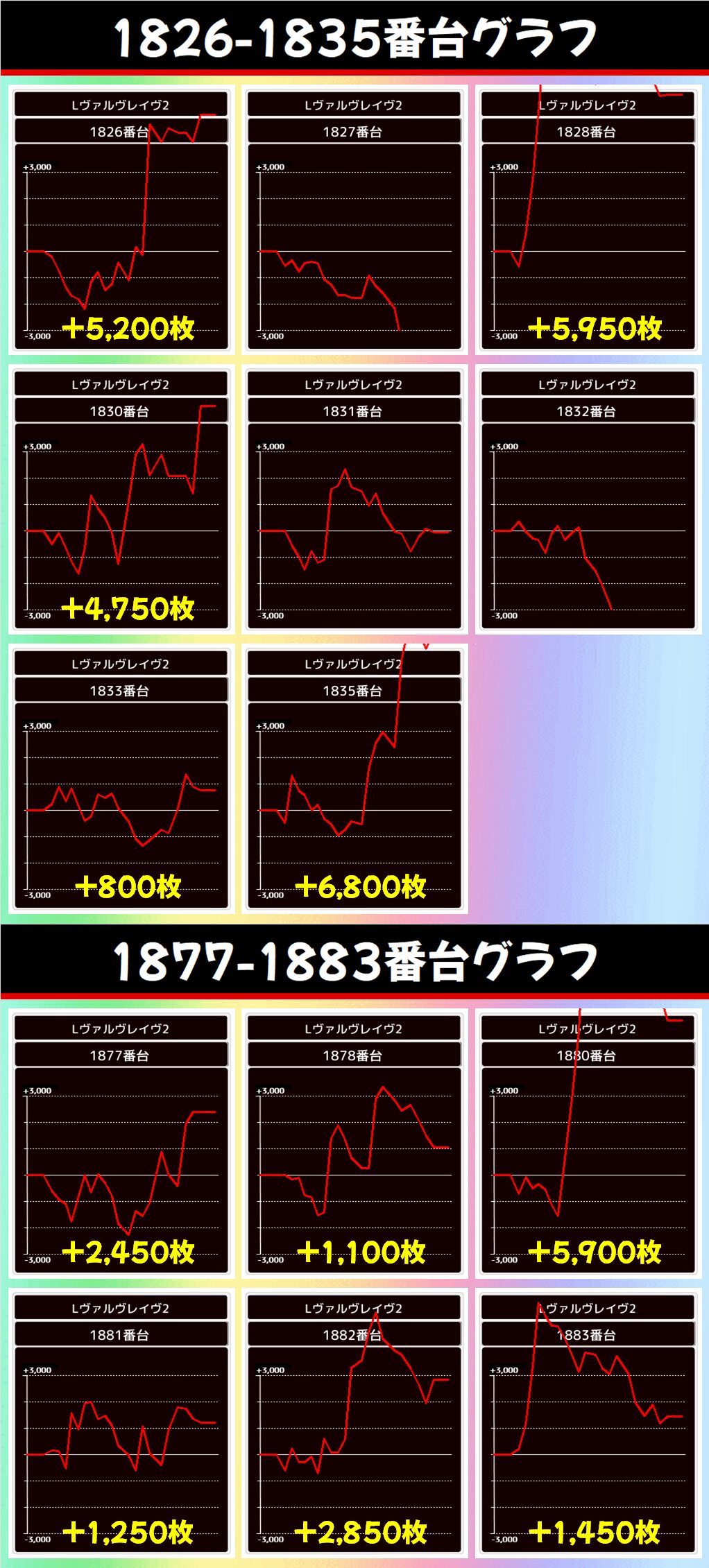 明らかに青頂からの一撃で伸びている台が目立っていますね。設定5を多くつかって出玉をアピールしているようにも見えます。逆にジワジワとあがる台は偶数で4とか6でしょうか?