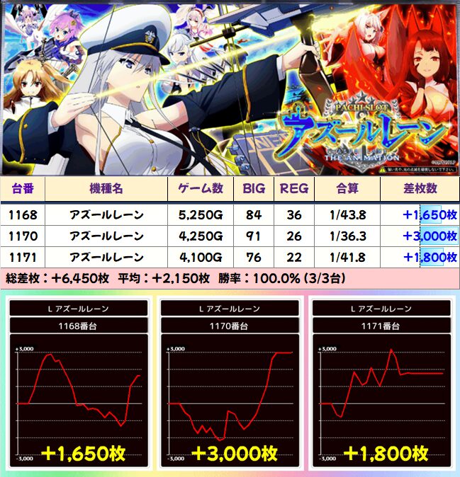 吸い込みも激しいアズレンで、3台設置とはいえ全台プラス差枚で終了。1168番台は最後によく巻き返しましたね…。