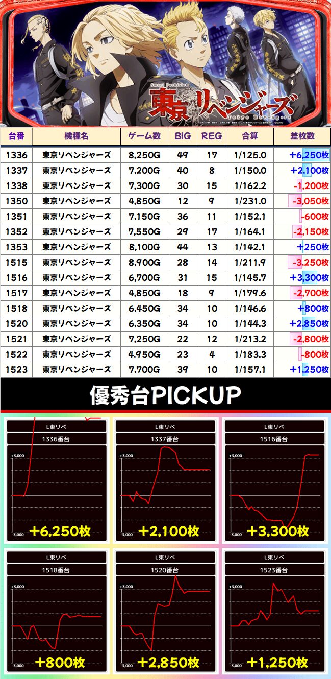 1336番台は最初の上位から全力で伸ばして、最後にちょっとだけグラフに線が出てます。コイツもなかなかの荒波機種ですね…。