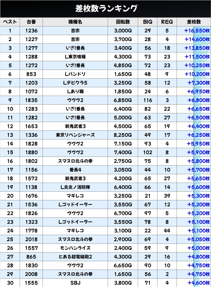 TOP5に吉宗・いざ!番長という大都マシンが4台も入ってきたランキング。いざ!番長のスゴさを物語るように、10位と11位にも入ってきてます。青頂が目指せる(=将軍が出やすい?)奇数設定には夢が詰まっているのでしょう。