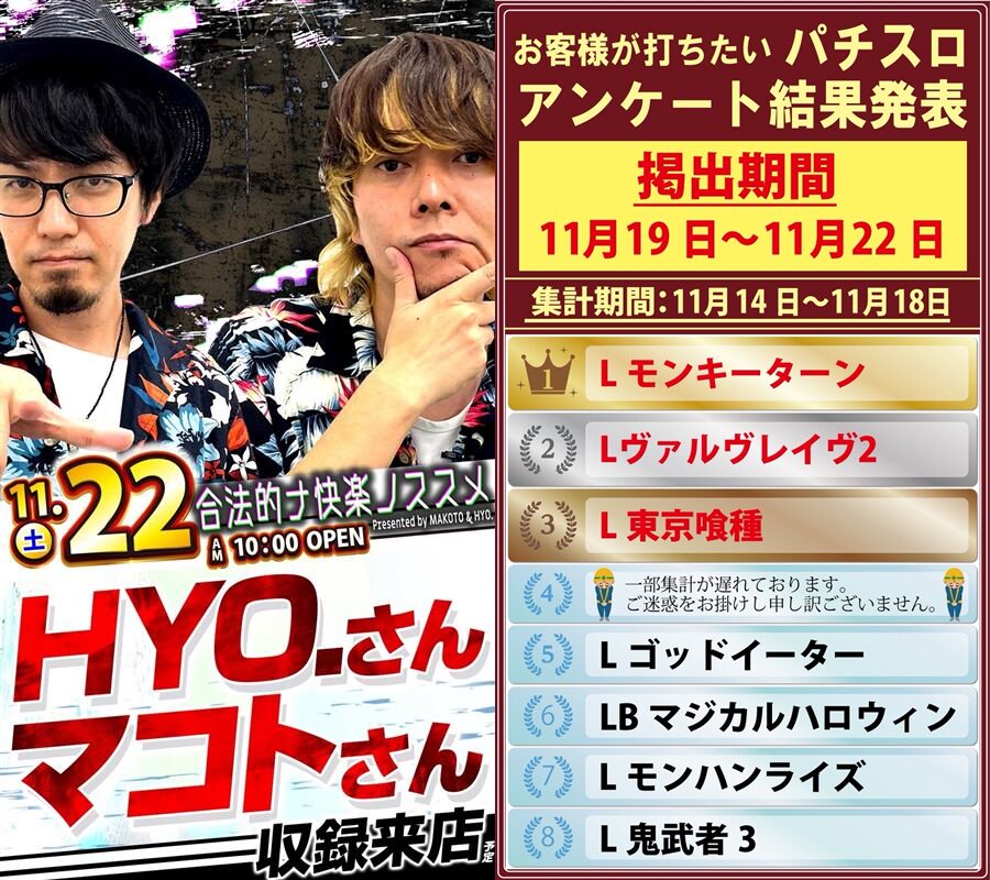 8位までの挙げられた機種には仕掛けがある傾向が強め。特に前日までに集計が遅れていて、店内で発表された機種もアリ。この日は4位が防振りだったようですが…?