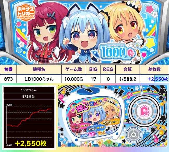 毎度おなじみ、毎月22日のお約束と化している1000ちゃんの設定H。もはや座ったらブン回すだけで勝ちが約束されたようなモノなので、抽選が1桁なら最有力候補筆頭ですねこれ。