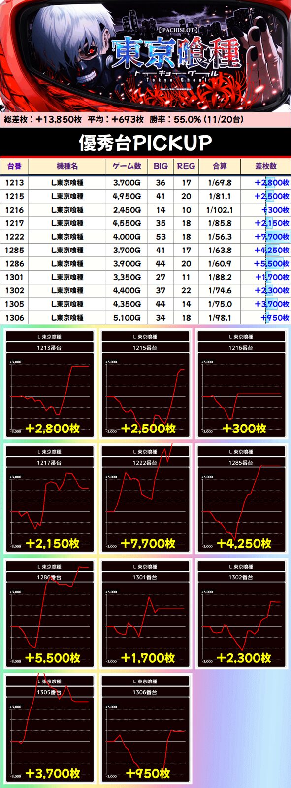 1/2系の仕掛けと思われる20台設置のグール。ここまできれいに上に伸びる台が多いと、やはり高設定は他にも起爆するきっかけがありそう?
