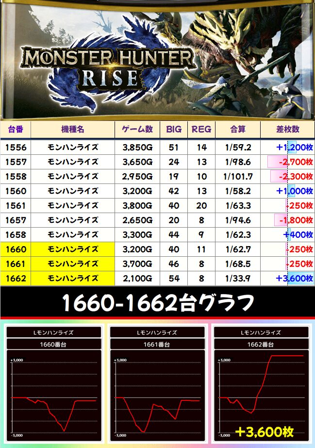 3台並びと思われる個所をピックアップ。有利区間を貫いて1662番台がシマTOPの出玉になりました。