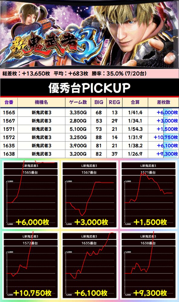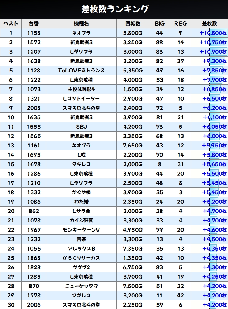 ランキングでは一番下になっていても、出方としては最も派手だったのが新鬼。6000枚overは4台もあり、そのうち1台は万枚到達。上位ATがエグいですねコレ。