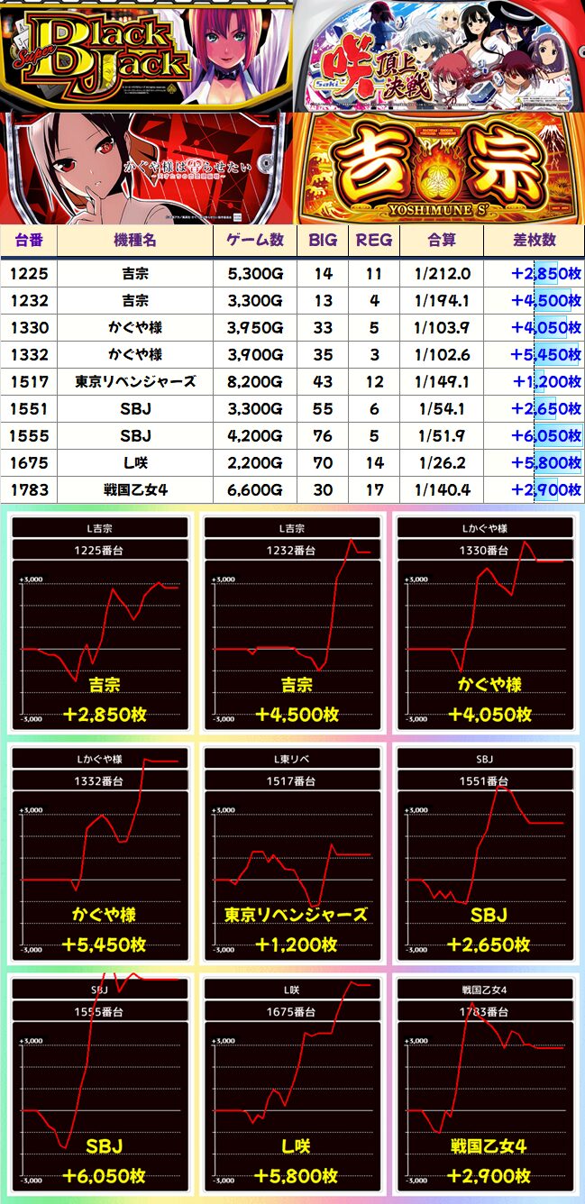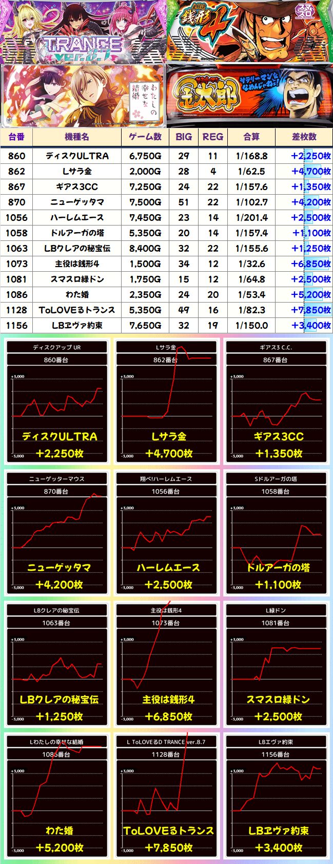 TOP出玉は新台のネオプラでした。今回はランキング機種の新鬼武者3の名前が目立ってますね。また、アレックス・ゲッタマも30位以内(かつ4000枚以上)という点にも注目。やはり22日はノーマルタイプを中心に攻めるべきではないでしょうか?安定した勝負を求めるなら、ぜひ朝からの参加を。1000ちゃんに座れれば勝利は固いといっても過言ではないかもしれません。