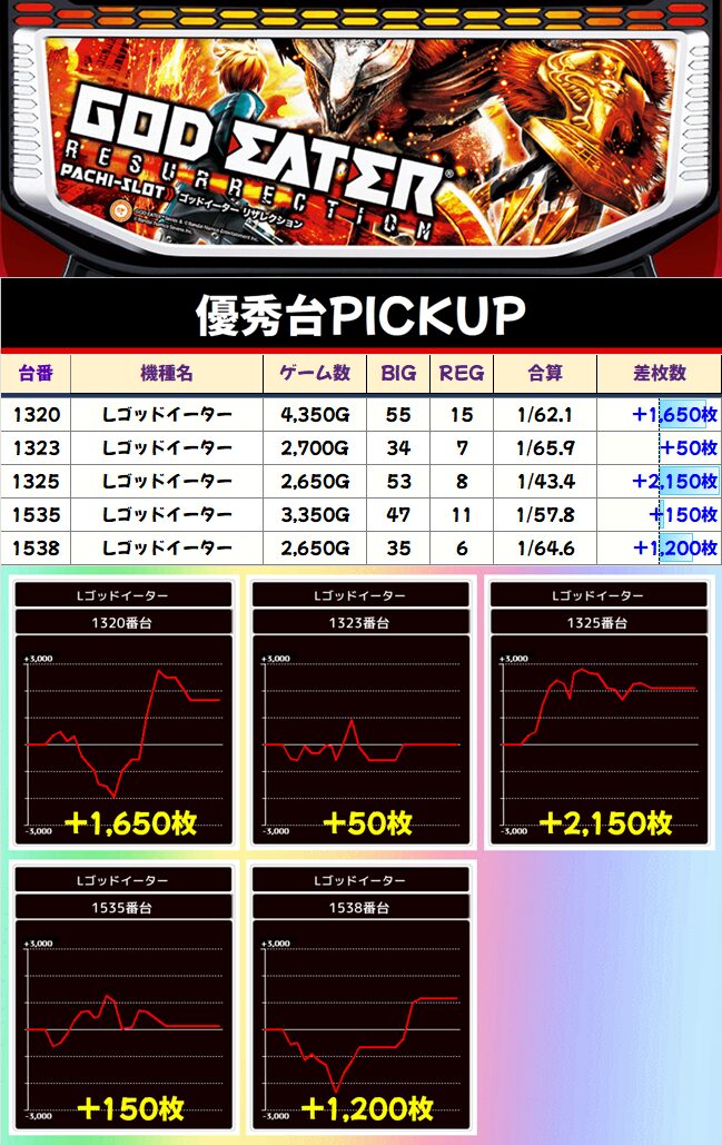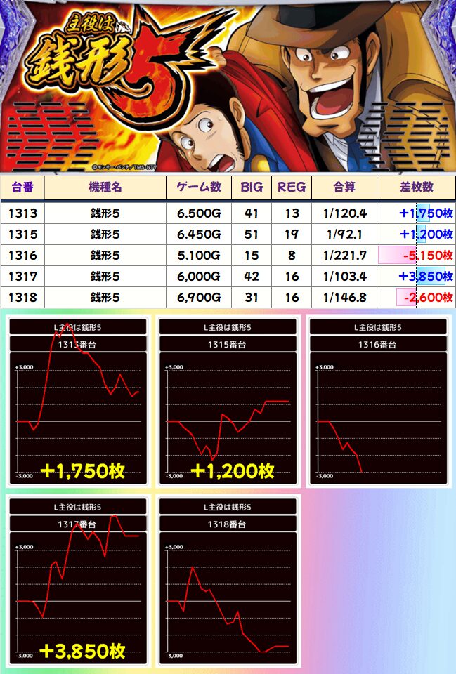 1315と1317番台の挙動は悪くなさそうです。ほとんどの台が6000G回されているなら、5000Gの1316番台はかなりキツい展開だったか。