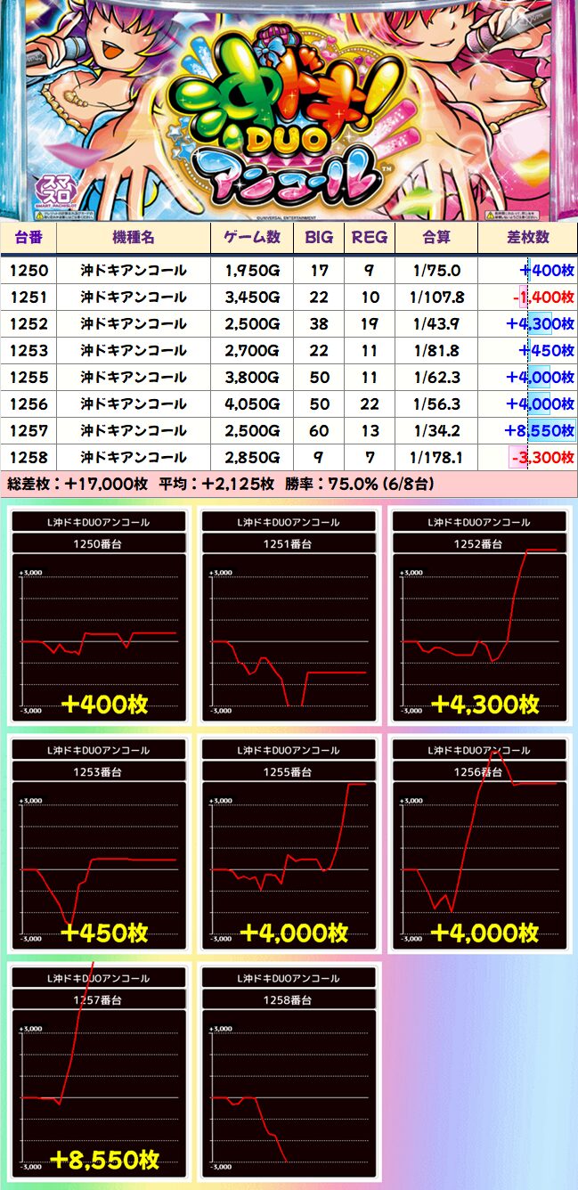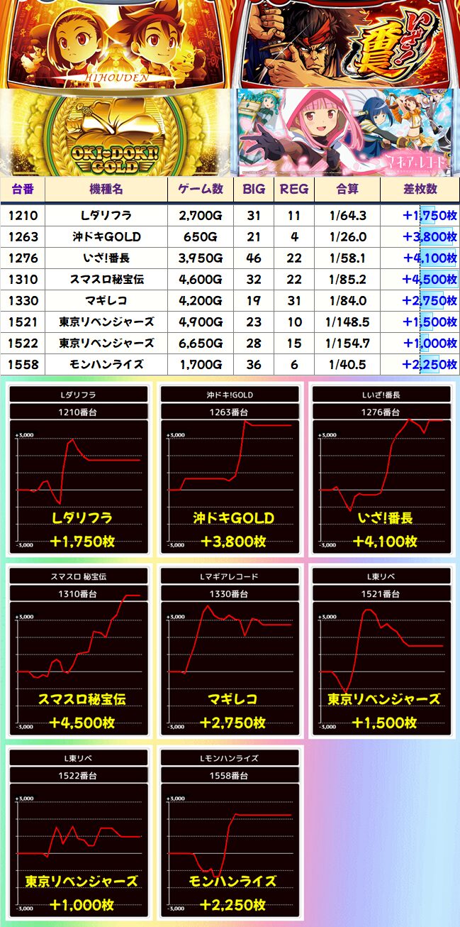 コイン持ちが初代沖ドキ並になったスマスロ初の沖ドキ。4台ほどスゴい伸び方をしているんですが、設定差があるとしたらドキハナチャンスあたりにもあるとか…?