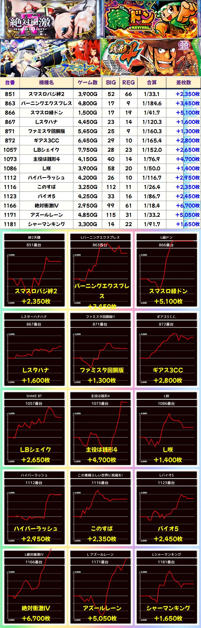 20台設置でプラス差枚のグラフが上記の通り。1881番台がかなり派手なハラキリドライブ絡みの一撃で大台に到達。