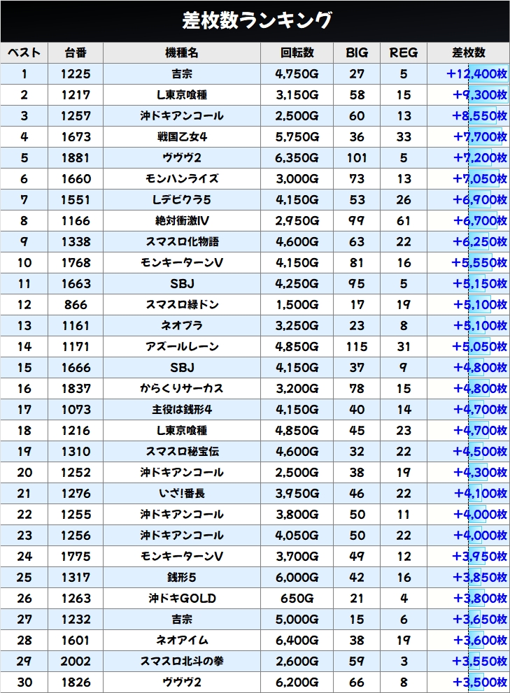 8台並び仕掛けと思わる沖ドキアンコールが4台ランクイン。10台も導入された機種なので、今後も要注目の機種となるでしょう。パラミサで10台以上の設置がある場合、8台並び仕掛けの対象になる可能性もあるのでチェックは必須!