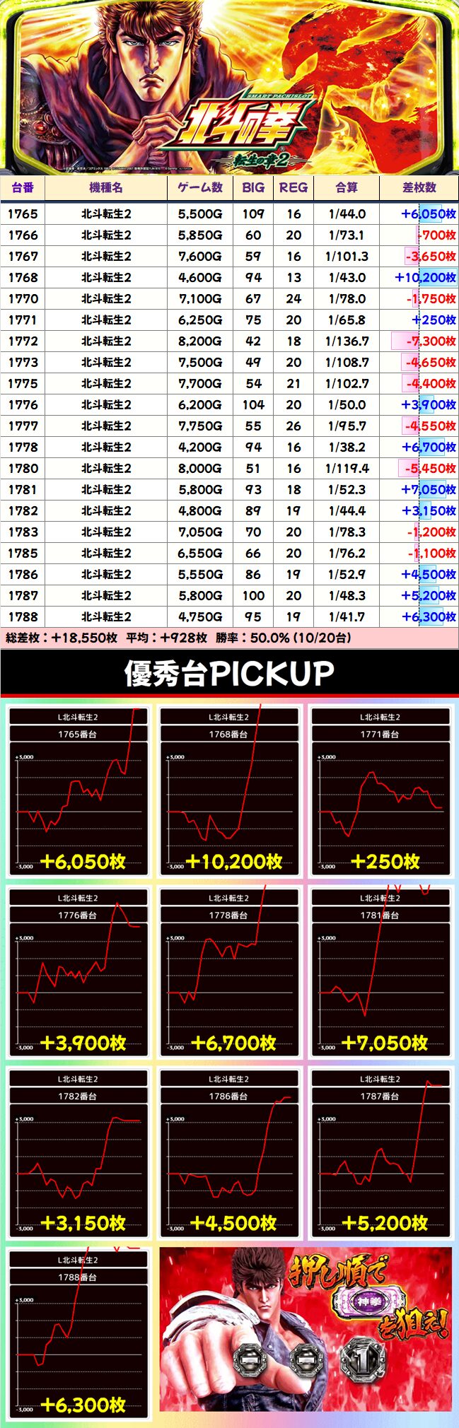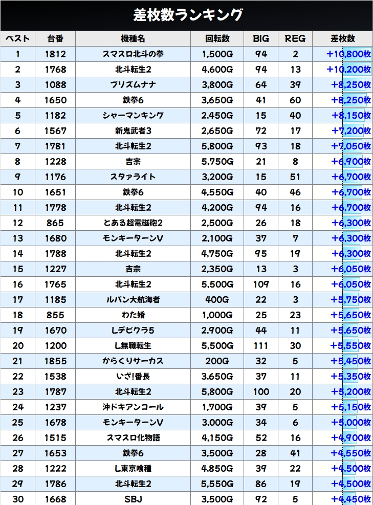 北斗転生2が7台もランクインしており、鉄拳6も3台ランクイン。つまり上位30台のうち3分の1を新機種の2つが占めていることになり、そのポテンシャルの高さを表しているランキングなってますね。