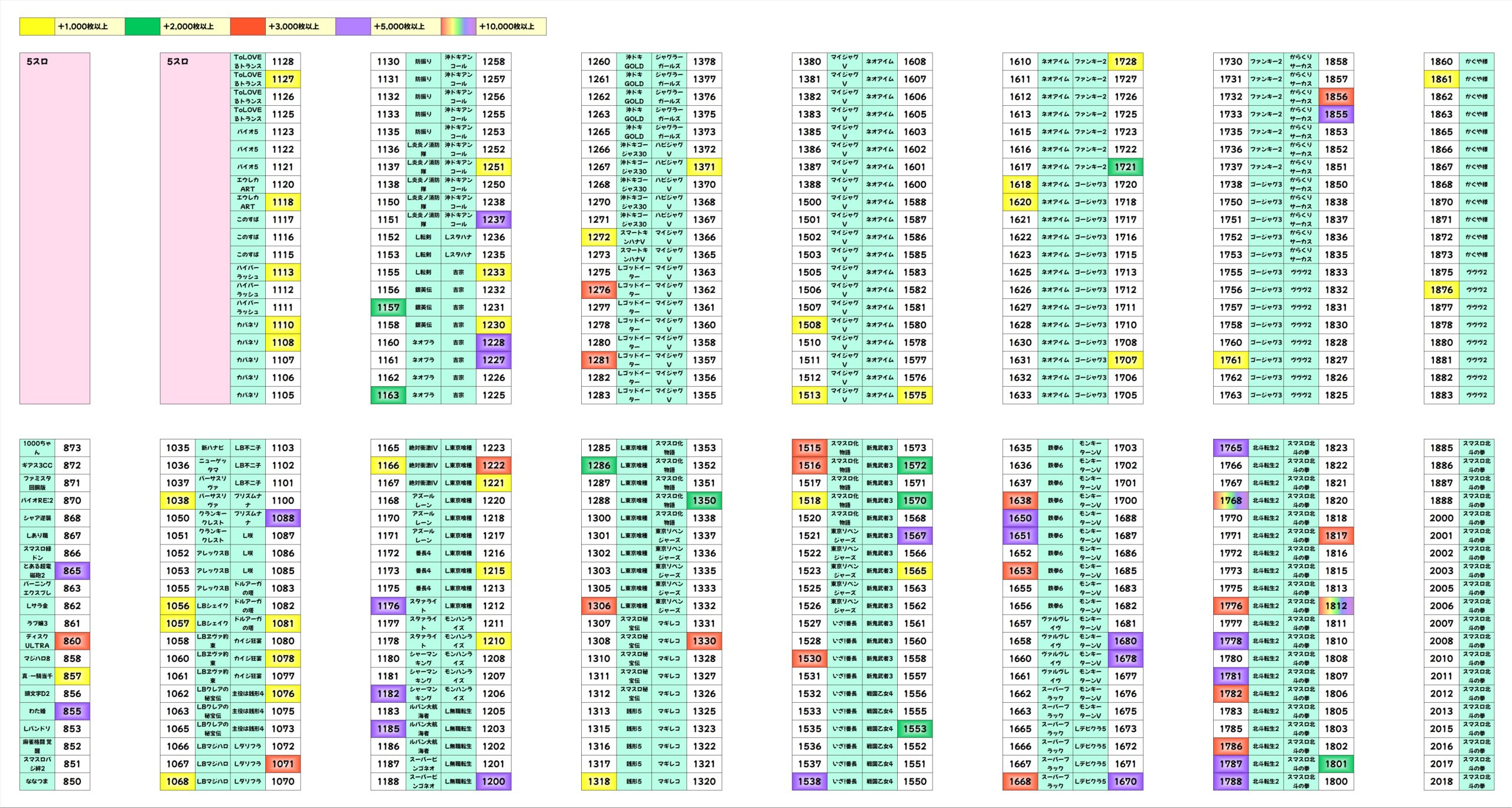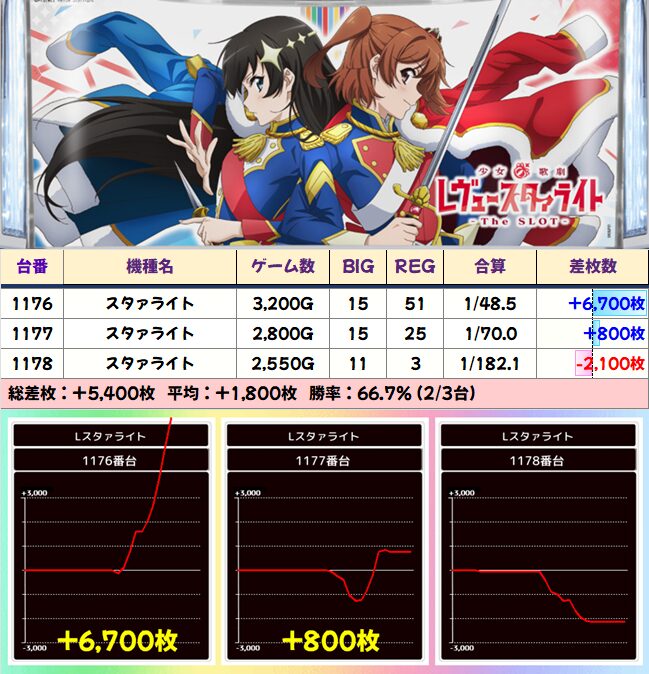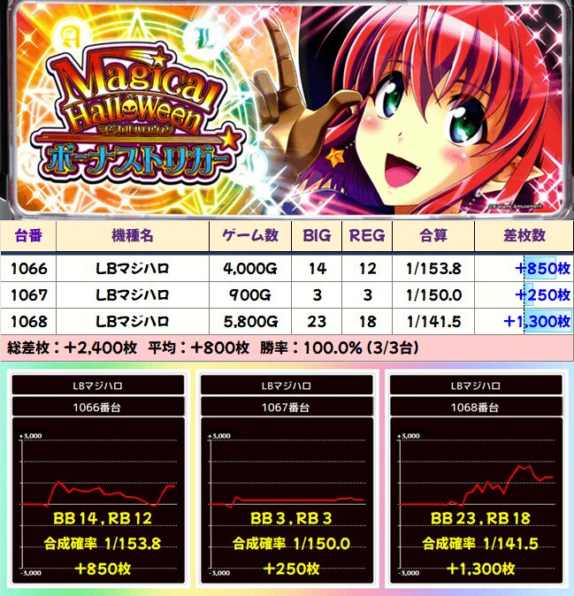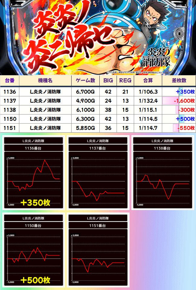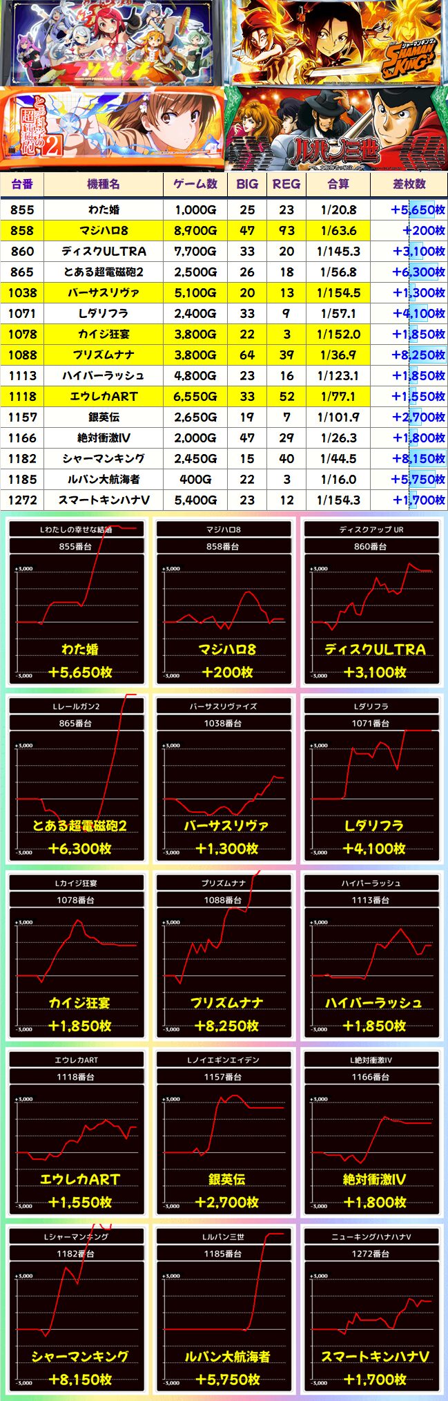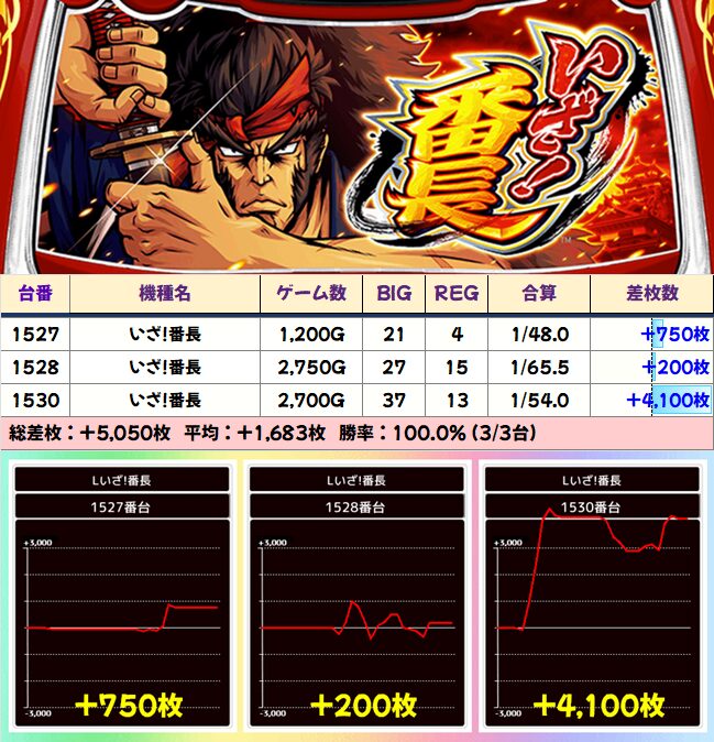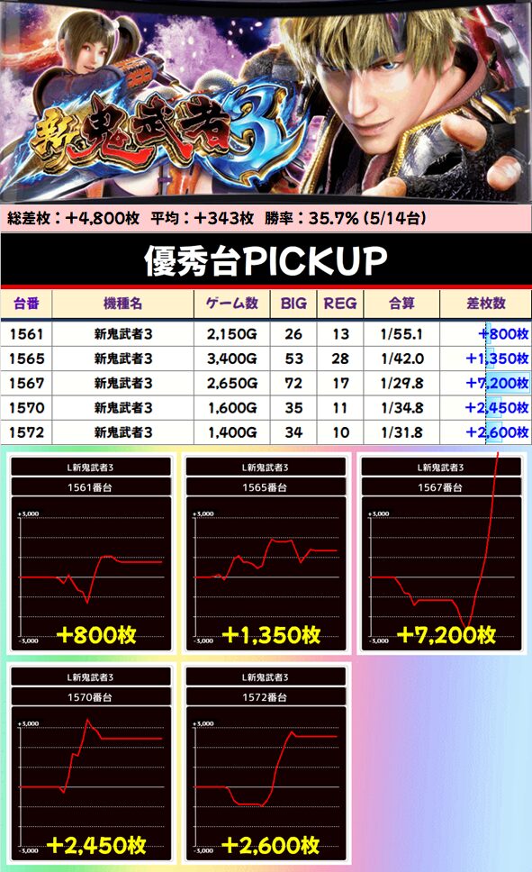 こちらも勝率は50%。出る枚数も吸い込む枚数も強烈で、ATに入れれば夢がある機種となっている模様。1550番台と1651番台は同じような挙動に見えますが、デビルラッシュ絡みか?そして1638番台も含めた3台並びの可能性もありそうです。