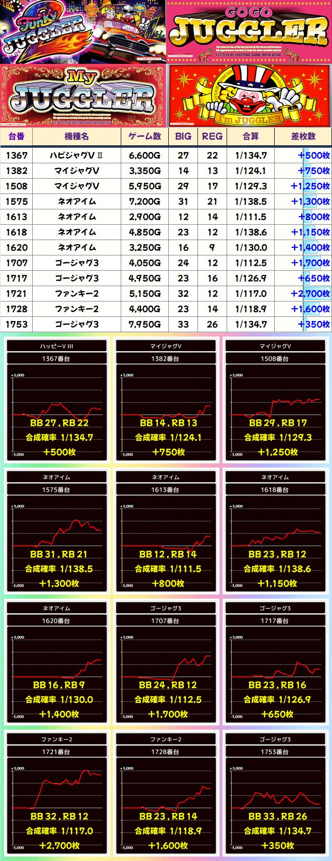 比較的合算確率が優秀なジャグは上記の通り。ジワジワとした展開が多い中で、1721番台のファンキー2が序盤に一撃2000枚のジャグ連が炸裂。